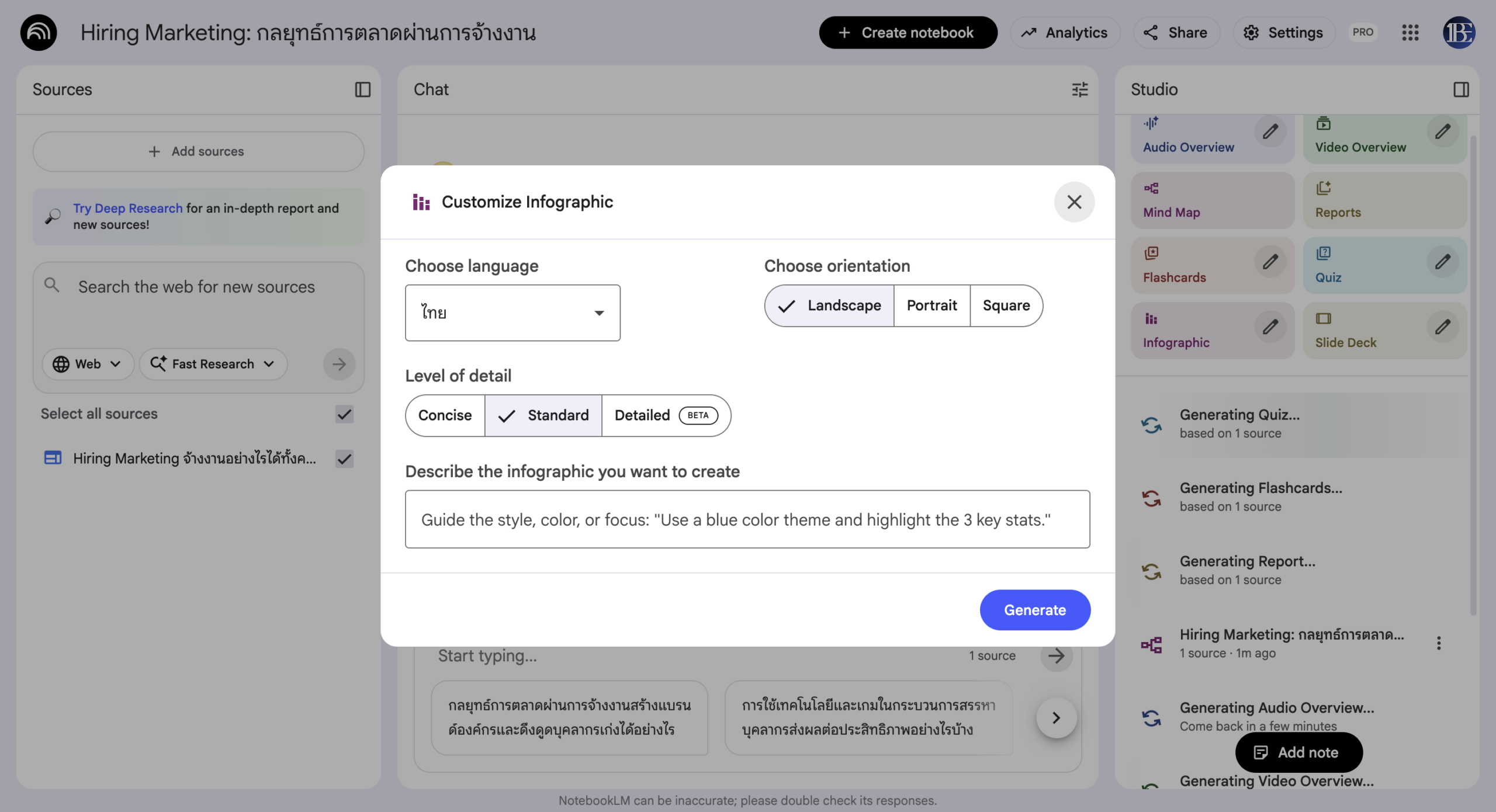 NotebookLM ช่วยทำ Infographic แบบเร็วมาก เลือกภาษา เลือกระดับความละเอียด และใส่คำอธิบายว่าอยากให้เน้นอะไร เช่น โทนสีฟ้า เน้นตัวเลขสำคัญสามจุด ใน Infographic สิ่งที่ควรสังเกตคือ Level of detail กับ Orientation ครับ