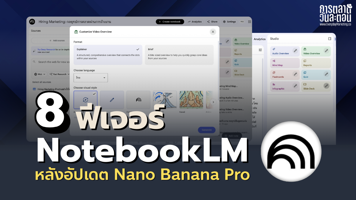 ช่วงหลังนี้ Google อัปเดตฟีเจอร์ใหญ่แบบรัว ๆ ชนิดที่คนทำคอนเทนต์ตามไม่ทัน โดยเฉพาะการมาของ Nano Banana Pro ที่ถูกออกแบบมาช่วยจัดการภาษาและงานสร้างสรรค์ให้แม่นยำกว่าเดิม และหนึ่งในบริการที่ได้ประโยชน์จากการอัปเกรดครั้งนี้คือ NotebookLM ซึ่งตอนนี้แอบซ่อนความสามารถใหม่ไว้เงียบ ๆ แต่ทรงพลังมาก บทความนี้เลยจะพามา ทำความรู้จัก NotebookLM คืออะไร พร้อมสรุปทั้ง 8 ฟีเจอร์หลังอัปเดต Nano Banana Pro ครับ