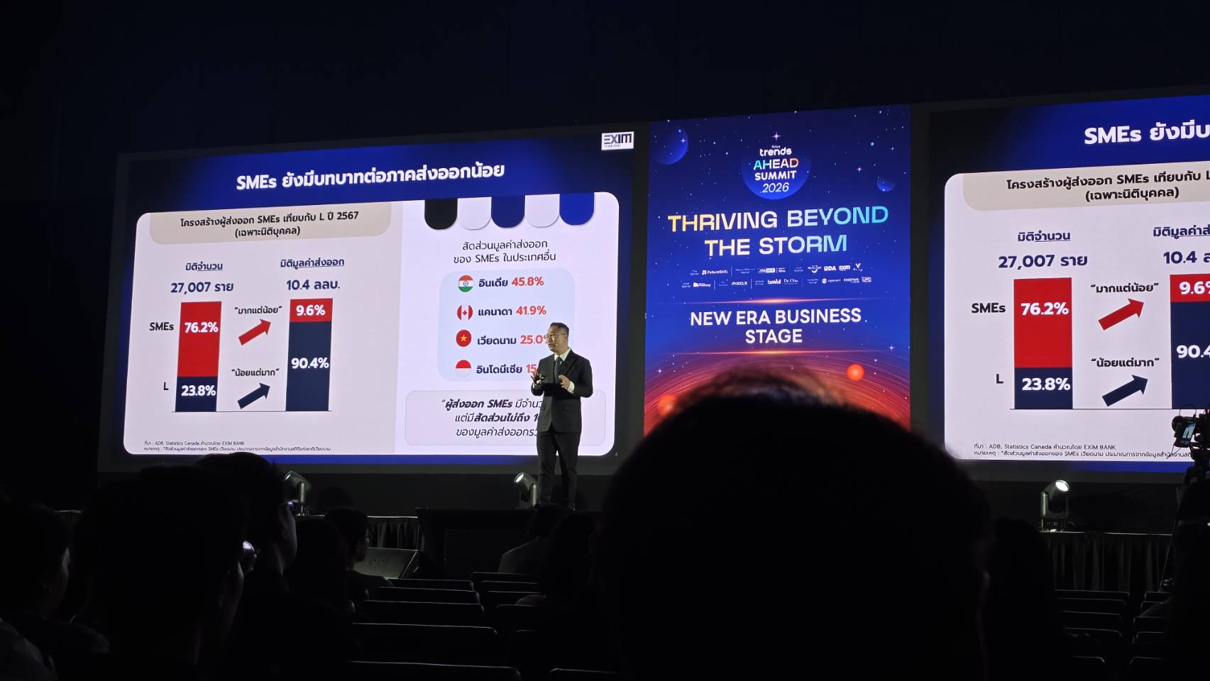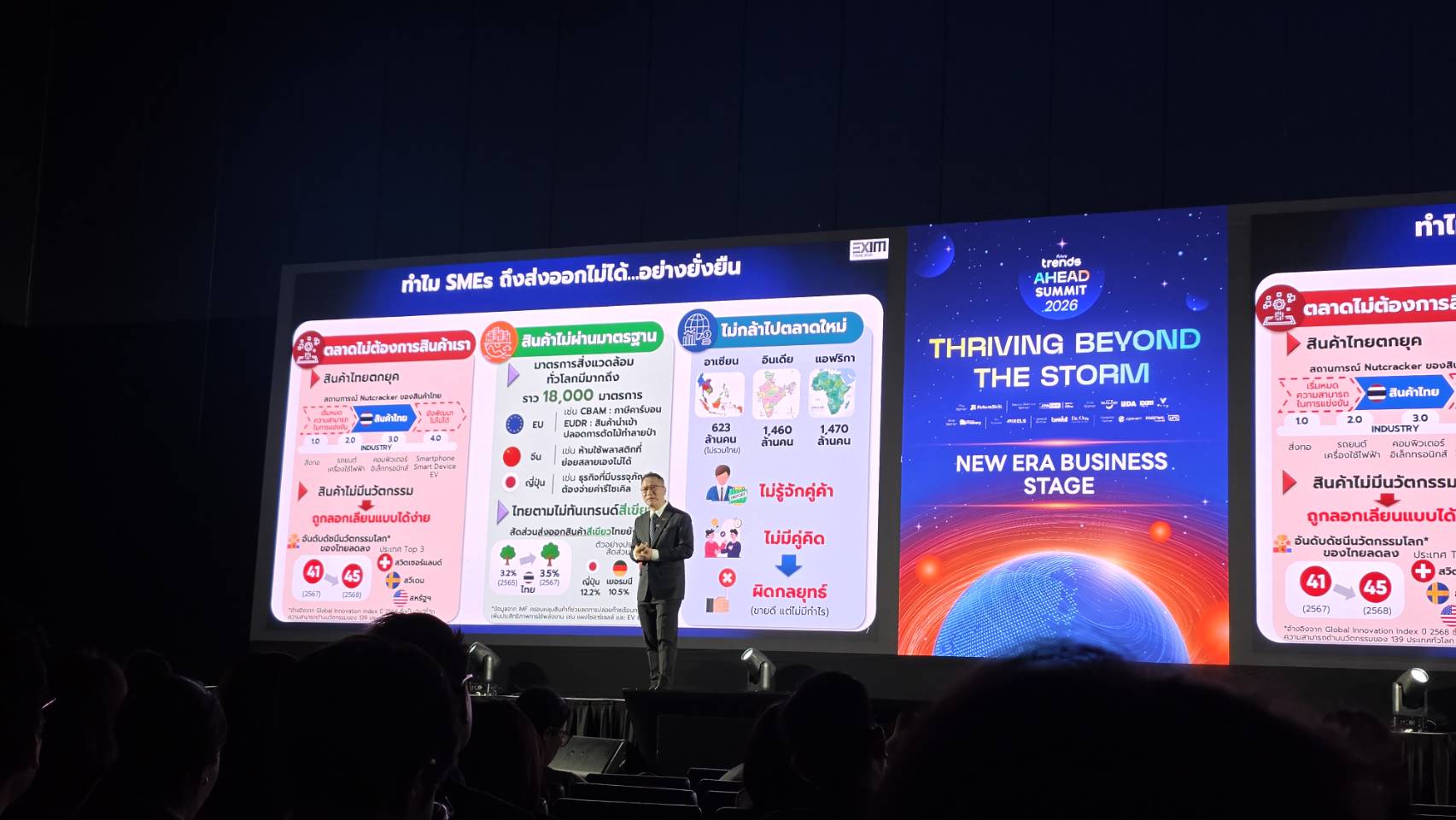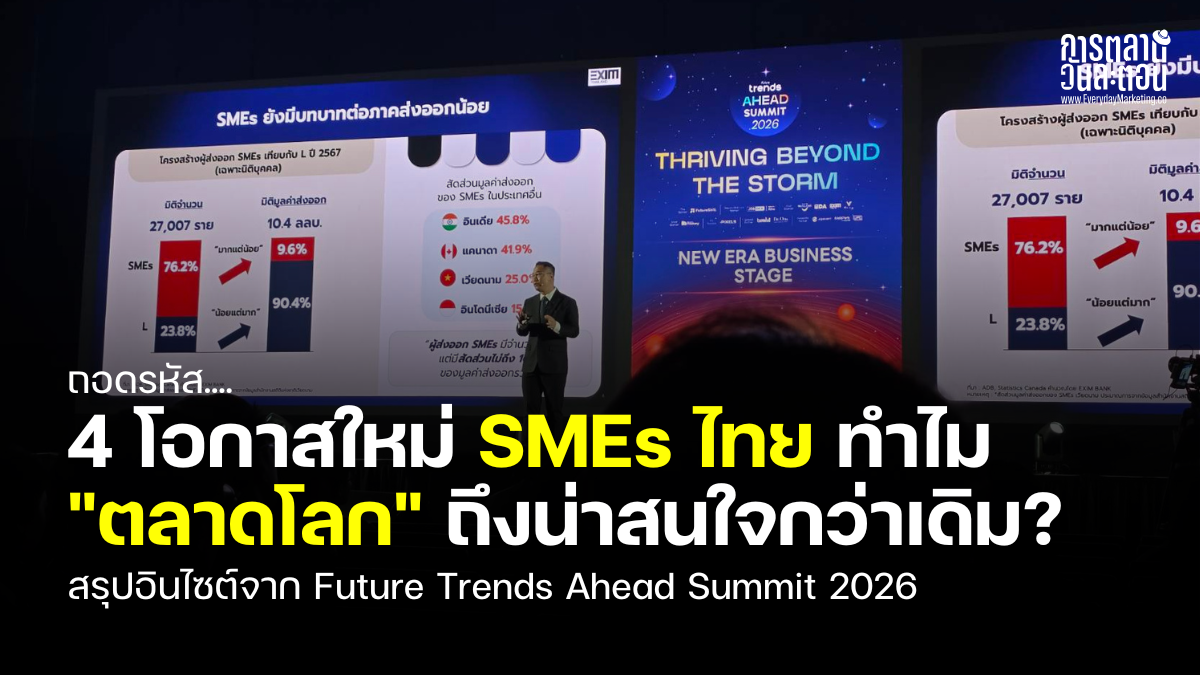 รู้ไหมครับว่า ปัจจุบันประเทศไทยเรามีผู้ประกอบการ SME ที่จดทะเบียนอยู่ในระบบประมาณ 3 ล้านราย แต่มีเพียงแค่ 27,000 ราย เท่านั้นที่มีการส่งออกสินค้าไปขายในต่างประเทศ ข้อมูลที่น่าสนใจนี้ ผมสรุปมาจากเวที Future Trends Ahead Summit 2026 ในเซสชัน “Beyond the Storm, Beyond Borders: ปลดล็อกศักยภาพ SMEs ไทยสู่เวทีการค้าโลก” ซึ่งบรรยายโดย คุณชลัช รัตนบุญนิธิ กรรมการผู้จัดการ EXIM BANK ครับ