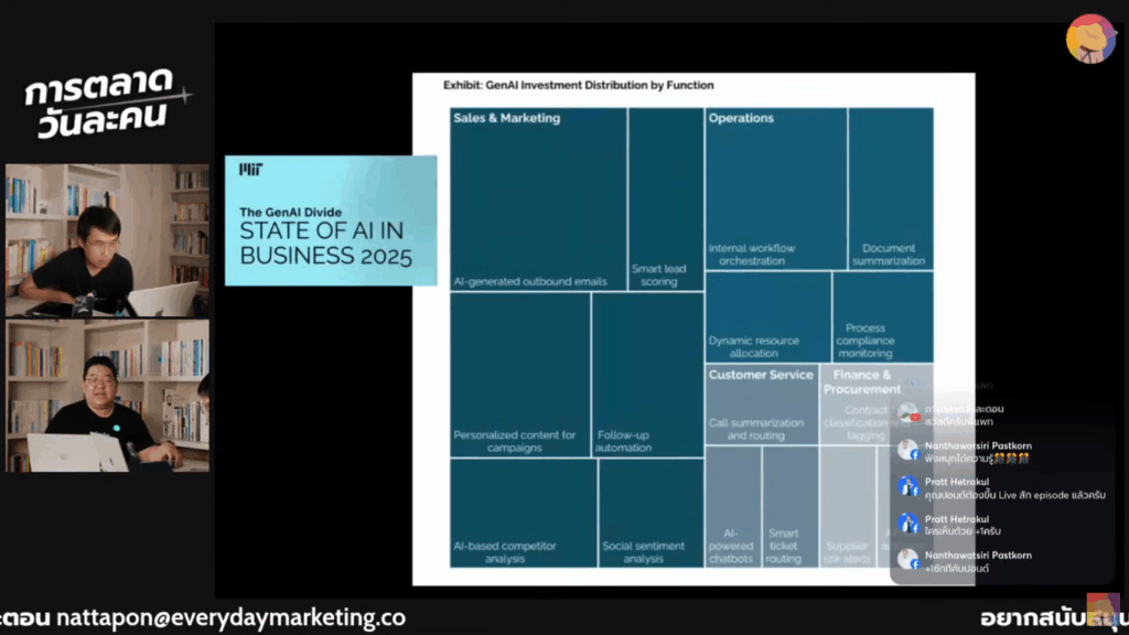 สุดท้ายจะเหลือเพียงงานที่ต้องใช้สมอง ทำให้เหลือเวลาไปสร้างสรรค์และพัฒนามากขึ้น ตัวอย่างของการผลิตชิ้นงานกว่าครึ่งของ AI เทไปที่ด้านการตลาดโดยยกตัวอย่างจาก The GenAI Divide State of AI in Business 2025: MIT โดยน้ำเงินเข้มกว่า 50% คือการตลาด น้ำเงินอ่อนด้าน Operation ด้านล่างใช้งานกับ Finance และ Customer Service