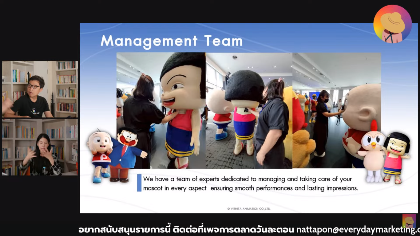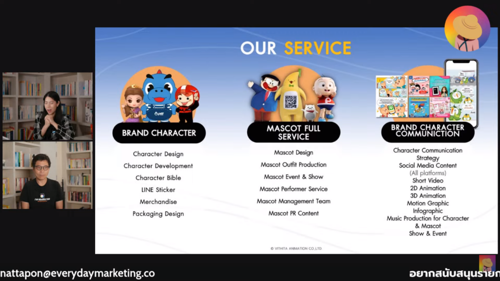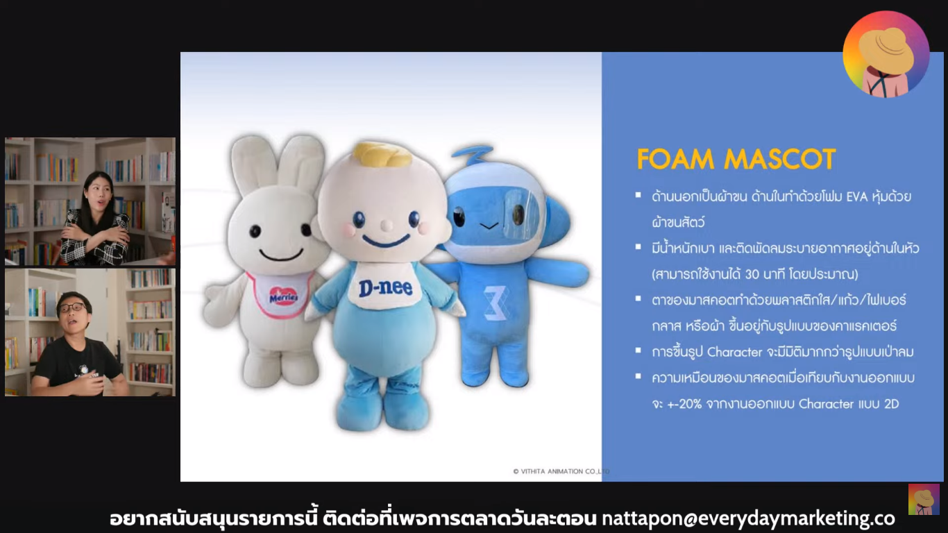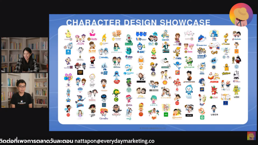 พร้อมแสดง Mascot ที่เคยออกแบบ อาทิเช่น SCB, Card X, Oriental Princess, Amazon ที่ไม่ได้มีแต่รูปแบบเด็กๆ แต่ปรับได้ตาม Persona ที่ตั้งเอาไว้ให้สะท้อน Brand Identity ผ่านแง่มุมที่น่าสนใจ คือความคุ้มค่าที่ไม่มีการหมดสัญญา ไม่เคยก่อดราม่าให้ภาพรักเสีย ไม่มีปัญหาสุขภาพ ตัวอย่างการต่อยอด Character Bible รวบรวมเรื่องพื้นฐานในการนำไปใช้ Do และ Don’t