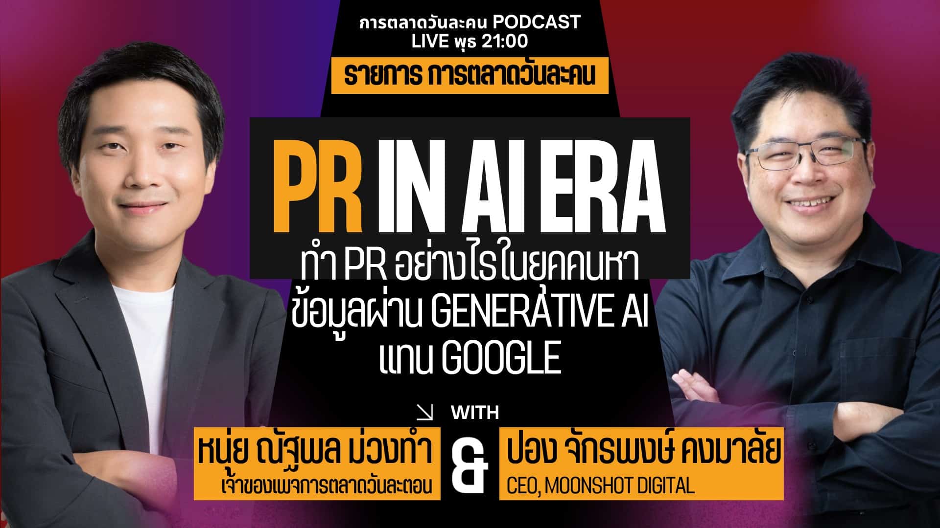 รายการ “การตลาดวันละคน” ครั้งนี้จะมาสัมภาษณ์ พี่ปอง จักรพงษ์ คงมาลัย CEO Moonshot Digital ในหัวข้อ PR in AI Era จะทำพีอาร์อย่างไรในยุคที่คนแชทถาม Generative AI อย่าง ChatGPT แทน Google แบบวันวาน ลองไปอ่านกัน