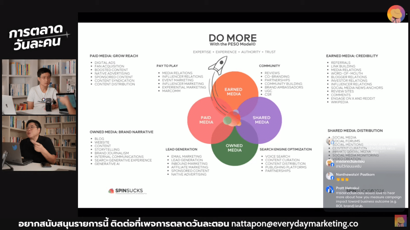 Paid คือสื่อที่ซื้อ, Own Media คือสื่อที่ดูแล, Earned Media สื่อที่มาสัมภาษณ์, Shared สื่อที่ถูกนำไปแชร์ต่อ โดยมองว่า Earned สำคัญเพราะน่าเชื่อถือ ดังนั้น PR ไม่ได้เป็นแค่ Earned แต่อยู่ในทุกตัวอย่างเหมาะสมจะนำไปสู่การเชื่อมโยงของทั้ง Ecosystem
