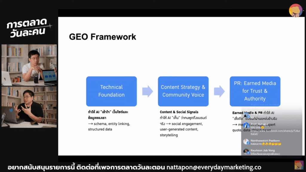 คือการเริ่มเรียนรู้กันไปพร้อมๆ กับการลองผิดลองถูก เช่น ถ้าคนค้นหาในอดีตจะเจอข้อมูลใน Google แต่ตอนนี้ปัจจุบันคนมีทางเลือกมากขึ้นในการหาใน Gen Ai แล้วจะทำอย่างไรให้น่าเชื่อถือ ในอดีตอาจจะเป็นการสร้าง Personal Branding และ Guest Post ในการสร้างตัวตน