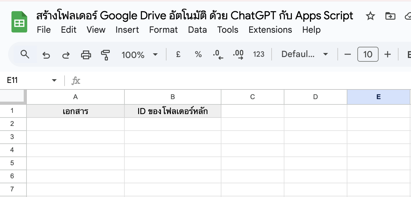 คอลัมน์ B (ถ้ามี): ID ของโฟลเดอร์หลักที่ต้องการให้โฟลเดอร์ใหม่ไปอยู่ภายใน ซึ่งหากต้องการสร้างทั้งหมดไว้ในโฟลเดอร์เดียวกัน สามารถใส่ Parent ID ไว้ในโค้ดโดยตรง แล้วเว้นช่อง B ว่างได้