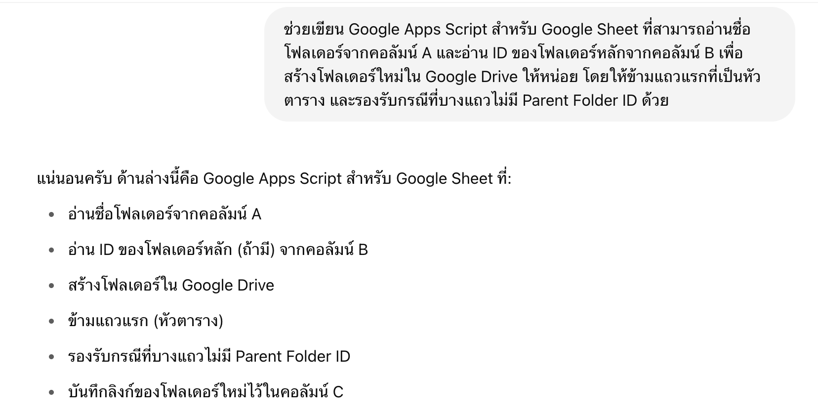 สิ่งที่ต้องบอก ChatGPT คือ “ช่วยเขียน Google Apps Script สำหรับ Google Sheet ที่สามารถอ่านชื่อโฟลเดอร์จากคอลัมน์ A และอ่าน ID ของโฟลเดอร์หลักจากคอลัมน์ B เพื่อสร้างโฟลเดอร์ใหม่ใน Google Drive ให้หน่อย โดยให้ข้ามแถวแรกที่เป็นหัวตาราง และรองรับกรณีที่บางแถวไม่มี Parent Folder ID ด้วย” GPT ก็จะให้โค้ดมาแบบนี้