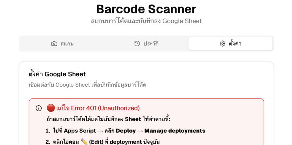 ต่อไปให้ทุกท่านกลับไปตั้งค่าในหน้า Website: https://barcode-reader-mtn3.vercel.app :Barcode Scanner by Panaya Sudta โดยเลือกไปที่ไอคอน “⚙️ ตั้งค่า”