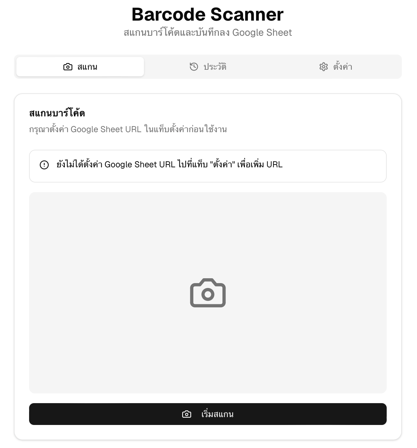 หน้าเว็บจะเป็น UI ง่ายๆ สำหรับเปิดกล้องและอ่านบาร์โค้ด ยังไม่ต้องสแกนนะคะ เพราะเราต้องตั้งค่าปลายทางก่อน