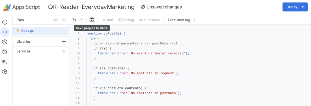 หลังจากวางโค้ดในช่อง Script เรียบร้อยแล้วให้ทุกท่านกด Save (💾)