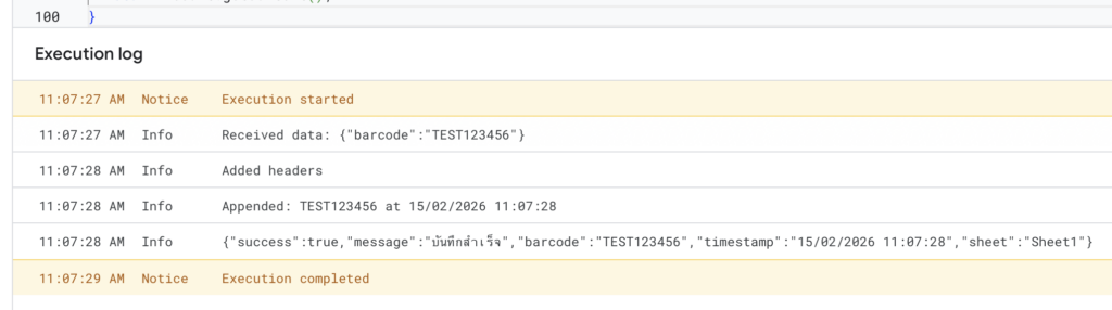 Logger.log('Appended: ' + barcode + ' at ' + timestamp);