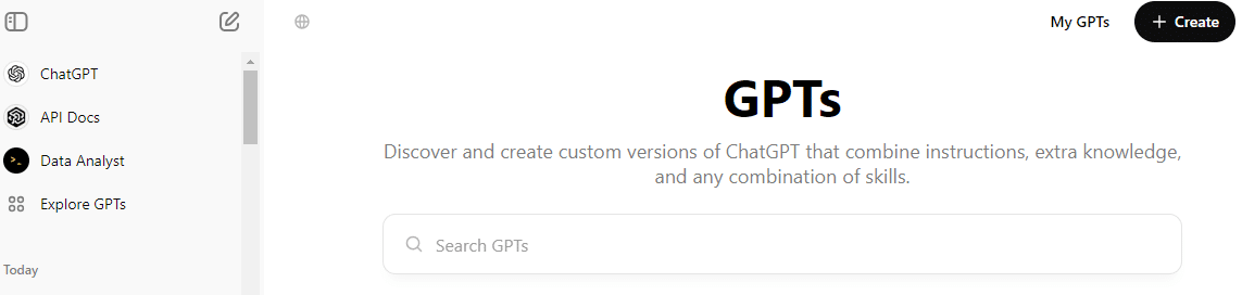 แต่ในบทความนี้เราจะมาสร้าง Custom GPT ที่ใช้ข้อมูลจากฐานข้อมูลที่เราจะป้อนให้กับ LLM ของเรา โดยให้เราคลิกเลือกไปที่ “+Create ” ที่อยู่ด้านมุมขวาบน