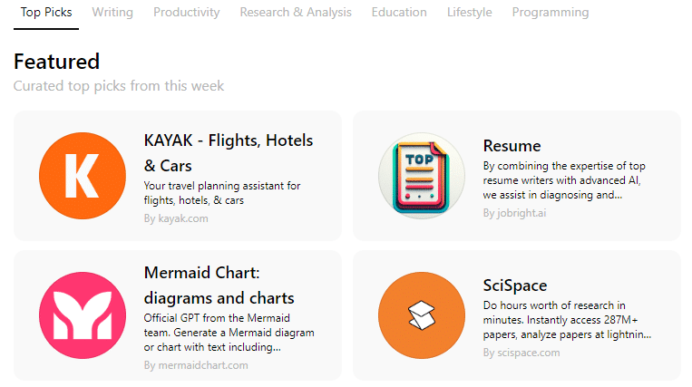 ซึ่งเมื่อเข้ามาแล้วก็จะพบกับหน้าที่แนะนำ Feature ที่ถูกสร้างขึ้นมาจากผู้สร้างคนอื่น ที่เราสามารถนำไปใช้ได้เลย (ถ้าตรงกับความต้องการใช้งานของเรา) โดย Custom GPT ได้ทำการแบ่งประเภทไว้ให้ได้แก่