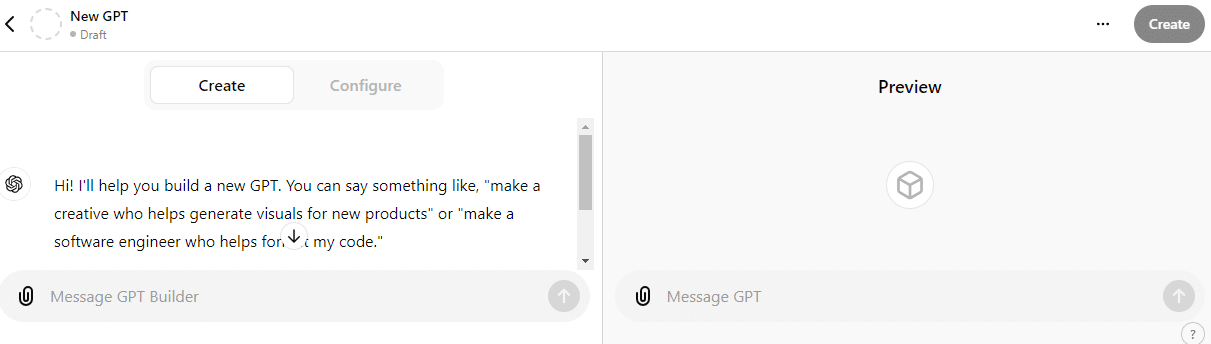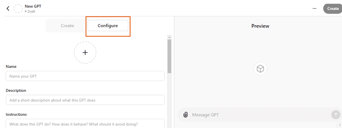 พอเข้ามาเสร็จ เราก็จะเจอหน้าแรกของการใช้งานที่ชื่อฝั่งซ้ายมือบนสุดก็ยังคงเป็น “New GPT” เป็นตัว Draft ที่เรายังไม่ได้มีการป้อน Data อะไรใดๆ เข้าไปค่ะ