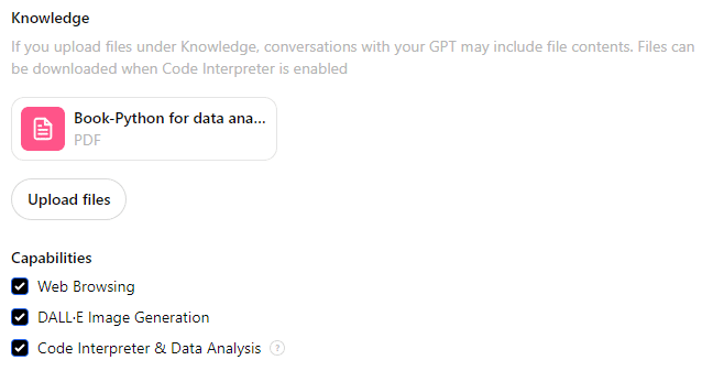 และเนื่องจากหนังสือเล่มนี้เป็นหนังสือเกี่ยวกับการทำ Data Analysis และมีการ Coding ด้วย ในส่วนของ “Capabilities ” ก็จะเลือก “Code Interpreter & Data Analysis ” เพิ่มเติมเข้ามาด้วยจากค่า Defult (แต่ต่อใช้ข้อมูลไม่ใช่หนังสือ Code นิกก็แนะนำให้เลือกเข้ามาเช่นกันนะคะ เพราะเรามักจะต้องการในส่วนของ Data Analysi s)