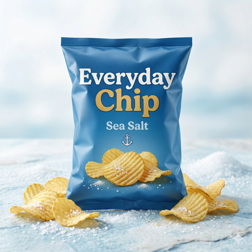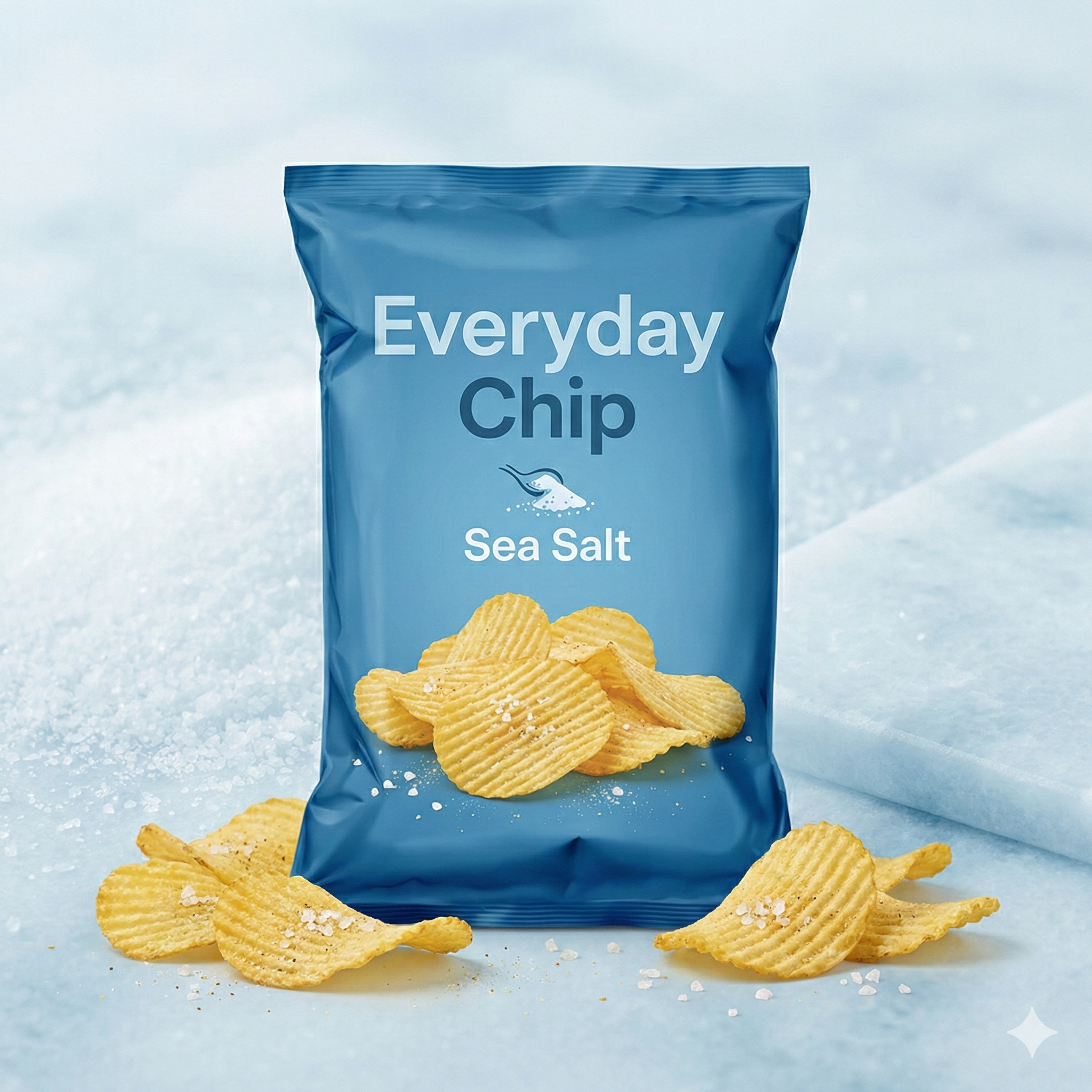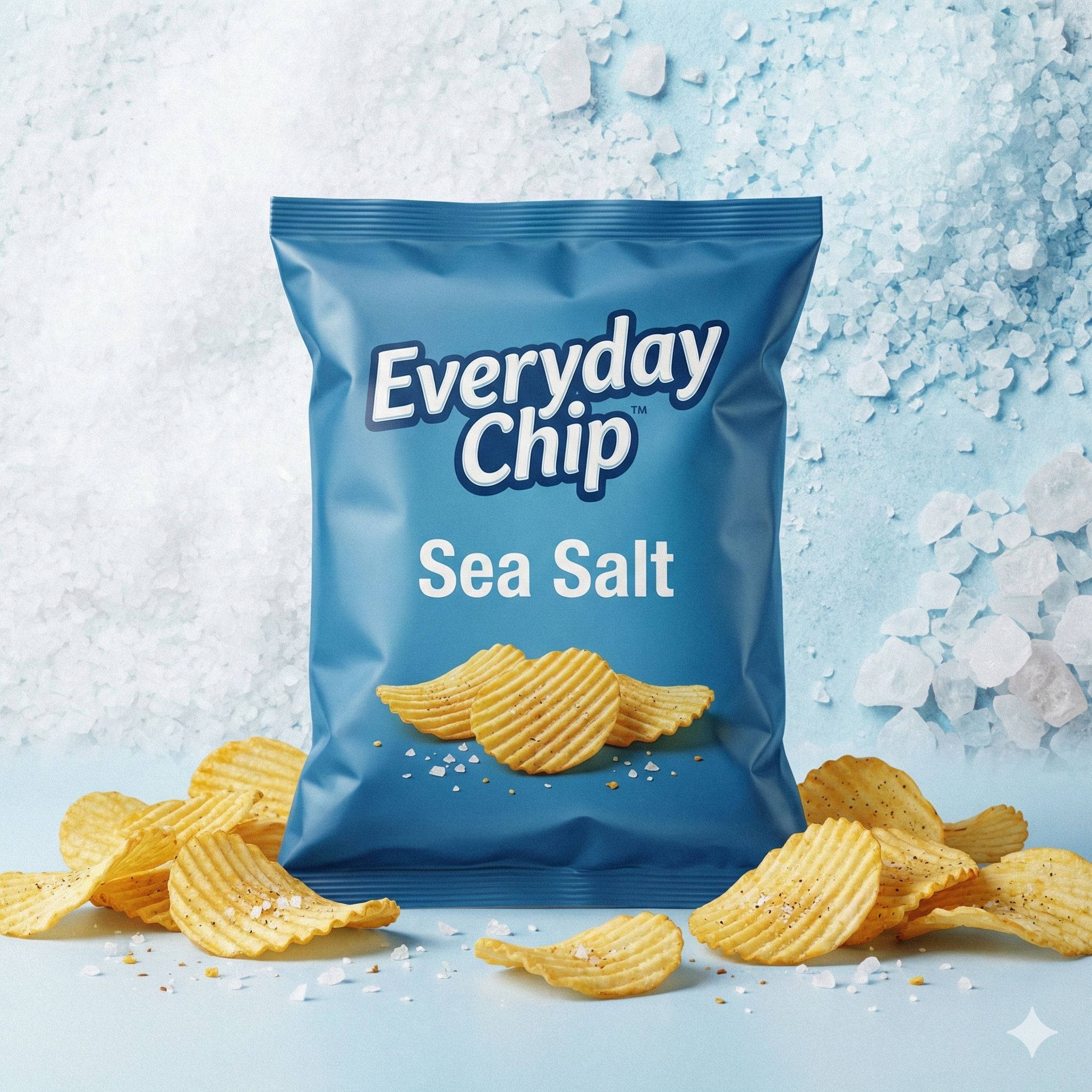 A cinematic premium product shot video in 16:9 aspect ratio featuring “Everyday Chip – Sea Salt.”