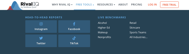 วิธีเข้าใช้งานคือ เข้าที่เว็บไซต์ https://www.rivaliq.com และเลือกที่ Free Tools หลังจากนั้นเลือกแพลตฟอร์มที่ต้องการขอรีพอร์ตได้เลยค่ะ ซึ่งนุ่นมีตัวอย่าง Facebook ให้ดู 1 แพลตฟอร์มดังนี้ :