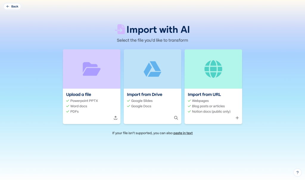 Import file or URL: หรือถ้าใครที่มีไฟล์ Powerpoint หรือไฟล์สไลด์อื่นๆ อยาก Re-create ใหม่ หรือจะเอาเนื้อหาจากเว็บไซต์มาทำก็สามารถอัปโหลดหรือแปะลิงก์ได้เลยครับ
