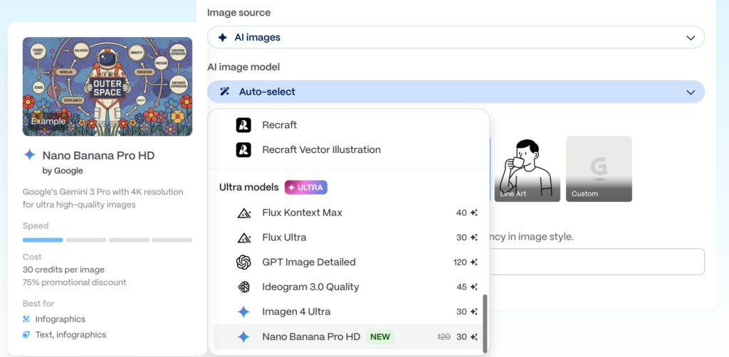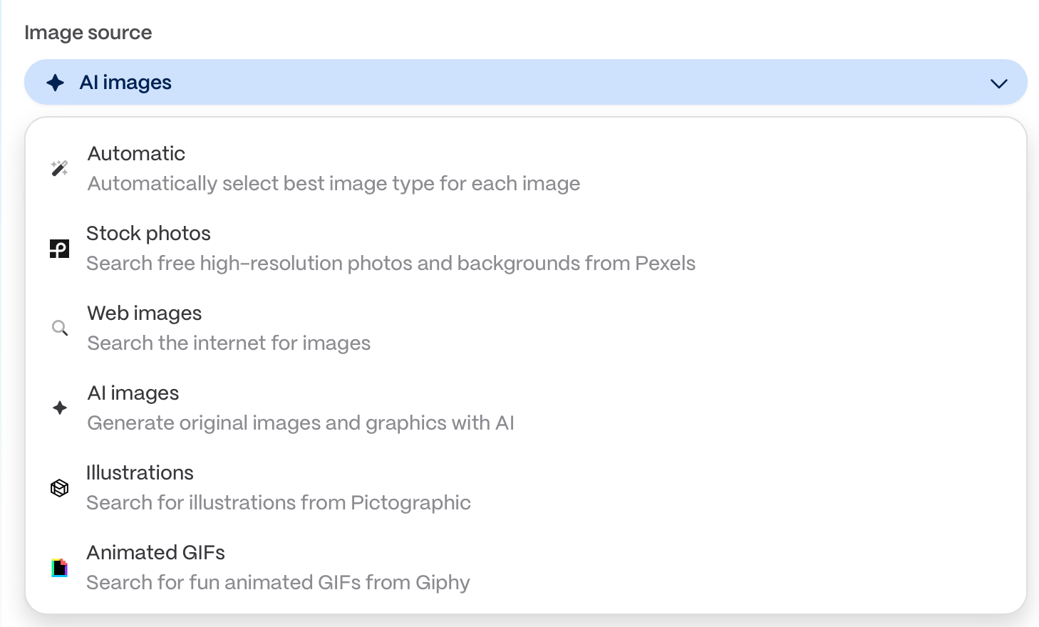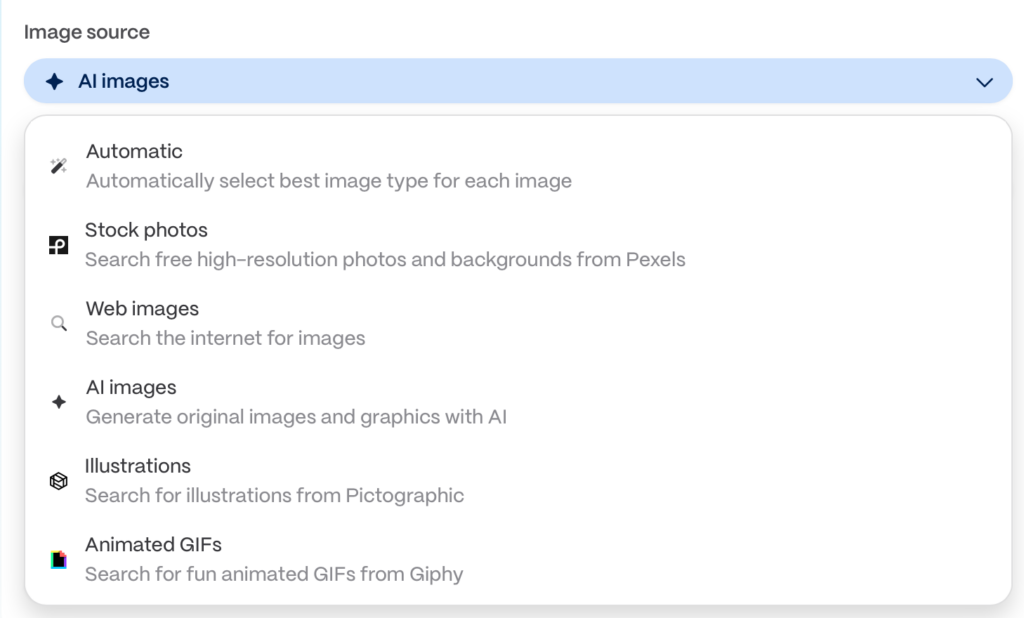 นอกจากนั้นเราสามารถตั้งค่าได้ว่า Image source หรือภาพประกอบที่จะอยู่ในสไลด์ เราต้องการให้มีที่มาจากไหน ไม่ว่าจะเป็ฯจาก Stock photos ที่ภาพคมชัด ถูกลิขสิทธิ์ หรือ Web images ที่ search จากอินเทอร์เน็ต หรือ สร้างภาพด้วย AI ทั้งหมด หรือ ปรับอัตโนมัติแล้วแต่บริบทของเนื้อหาก็ทำได้ครับ