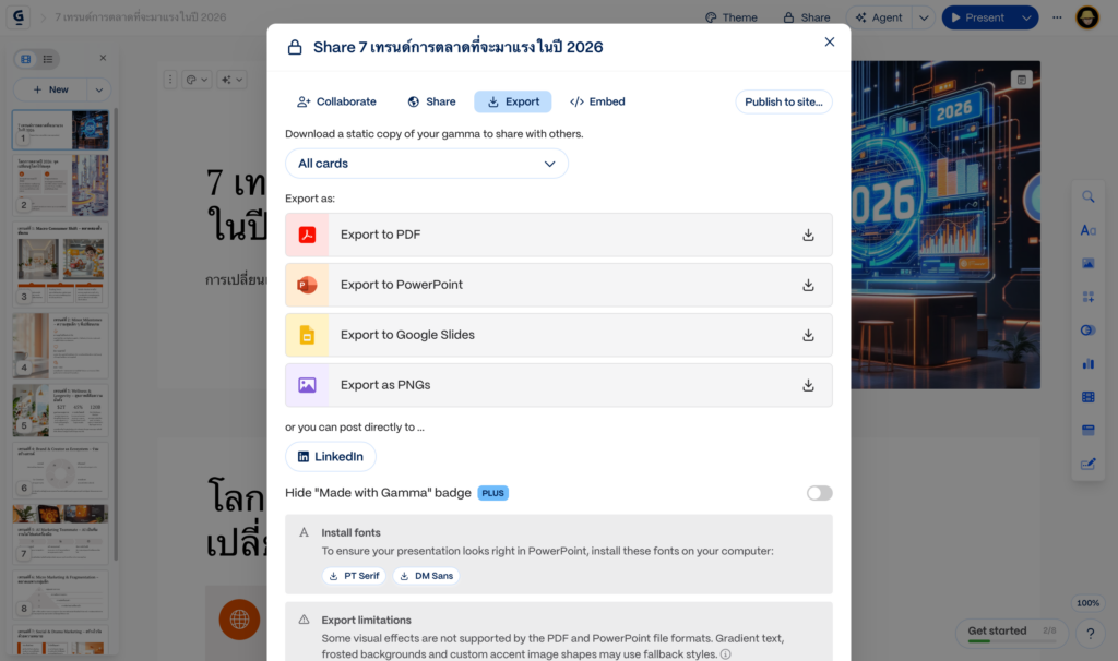 หรือถ้าอยากปรับแต่งแบบละเอียด ก็สามารถกด Export ได้ เพียงเข้าไปที่ปุ่ม Share บนด้านขวามือ ซึ่งเราสามารถเลือกได้ว่าต้องการ Export ในรูปแบบไหน ซึ่งรองรับทั้ง PDF, PowerPoint, Google Slides และ PNG ครับ แต่ว่า Export แล้วก็จะมีลายน้ำตรงด้านขวาว่า Made with Gamma ถ้าต้องการลบออกต้องสมัครแบบ Plus ขึ้นไปครับ