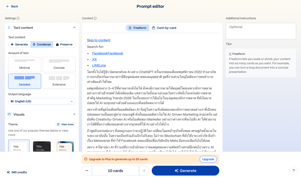 เมื่อคลิกเข้าไปที่ Generate แล้วก็จะมีหน้านี้ขึ้นมา ซึ่งด้านบน Text box ก็จะมีเลือกปรับแต่งได้ว่าเราต้องการ Presentation กี่หน้า ซึ่งแบบฟรีได้สูงสุดถึง 10 หน้า ส่วนแบบ Plus 20 หน้า แบบ Pro 50 หน้า และแบบ Ultra 75 หน้าเลยทีเดียวครับ และสามารถปรับไซซ์ได้ว่าต้องการแบบ Traditional อัตราส่วน 16:9 หรือแบบ Tall 4:3 และปุ่มขวาสุดสำคัญเลยคือภาษา อย่าลืมเปลี่ยนเป็นภาษาไทยด้วยนะครับ