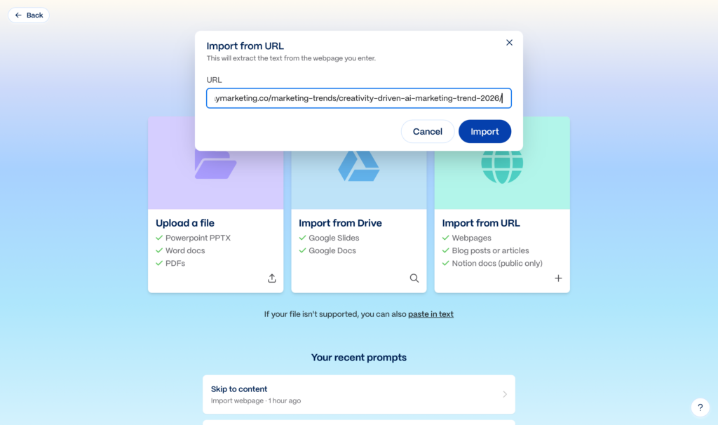 เมื่อกด Import from URL แล้ว ก็ใส่ลิงก์ที่เราต้องการจะสร้างจากเนื้อหานั้นได้เลยครับ ซึ่งในตัวอย่างนี้ผมจะลองใช้บทความ Creativity Driven AI เทรนด์การใช้เอไอในการตลาด Marketing Trends 2026 กันดูครับ