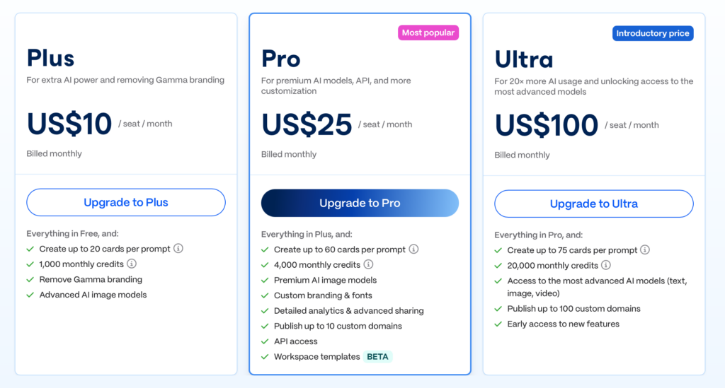 ถ้าเพื่อนๆ อยากลองใช้ก็สามารถเข้าไปลองกันได้นะครับ ซึ่ง Gamma.app แจกเครดิตให้ใช้งานแบบฟรีถึง 400 เครดิตเลยทีเดียว หรือถ้าใครใช้แล้วชอบ อยากอัปเกรดให้สร้าง Presentation ได้เยอะขึ้น ก็สามารถดูรายละเอียดแพ็คเกจราคาที่ภาพนี้ได้เลยครับ