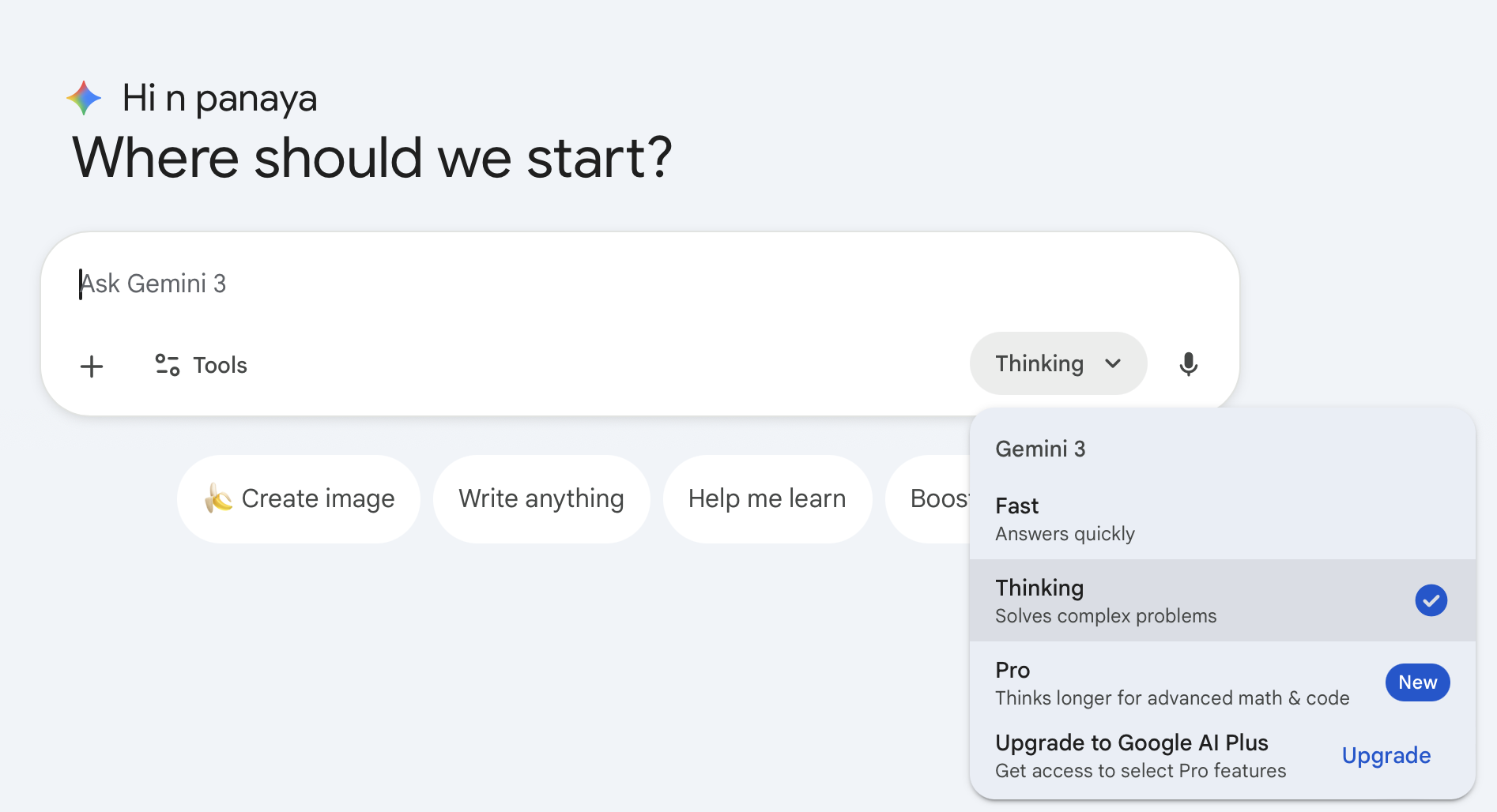 2.1 เริ่มต้นการเข้าใช้งาน ให้ทุกท่านไปที่ gemini.google.com (ปัจจุบันแพ็กเกจฟรีก็รองรับนะคะ) แล้วให้เปลี่ยนโมเดลจาก Default ที่เป็น Fast อยู่มาเป็น “Thinking ”