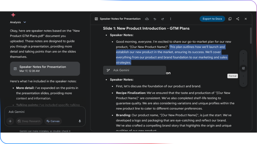 Natural Language Editing: บน Canvas นี้เราไม่ต้องไป Debug โค้ดแต่ละบรรทัดเองเองค่ะ ซึ่งสามารถทดแทนการ Debugging ได้จาก Select and Ask คืออยากแก้จุดไหนก็คลิกที่ปุ่มหรือเมนูนั้น แล้วพิมพ์บอก Generative AI ในสิ่งที่เราต้องการแก้ไขได้เลย เช่น “เปลี่ยนสีเป็นโทนพาสเทล” หรือ “ขยายขนาดฟอนต์ให้ใหญ่ขึ้น” โดยระบบจะจัดการแก้โค้ดหลังบ้านให้ทันที
