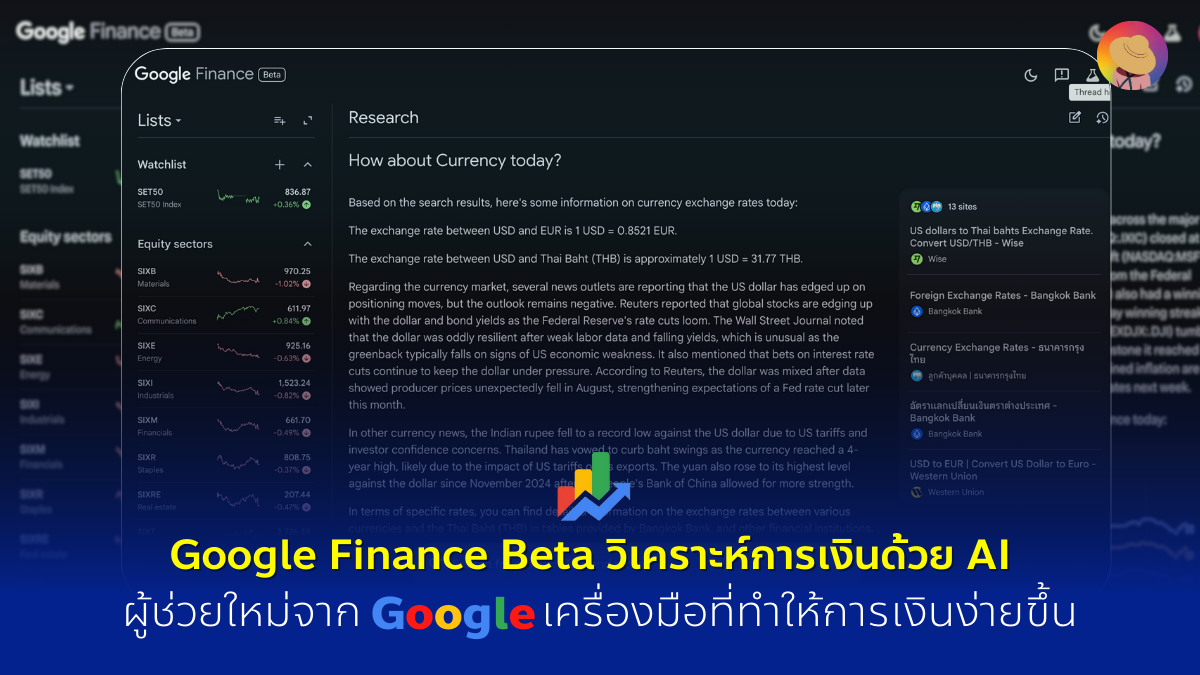 Google Finance Beta คือการอัพเดทใหม่ของแพลตฟอร์มการเงินจาก Google ที่ยกระดับจากการเป็นเว็บไซต์แสดงกราฟและตัวเลขทั่วไป สู่การเป็น “ผู้ช่วยวิเคราะห์การเงิน” ด้วย AI Research Panel ที่ผู้ใช้สามารถพิมพ์คำถามเกี่ยวกับตลาดหุ้น ค่าเงิน คริปโต หรือแม้แต่แนวโน้มเศรษฐกิจได้เหมือนคุยกับผู้ช่วยส่วนตัว โดยระบบจะสรุปคำตอบออกมาให้ จุดเด่นคือใช้ง่ายเหมือนคุยกับเพื่อน แต่ได้ข้อมูลครบถ้วนจากหลายแหล่งในหน้าเดียว เหมาะสำหรับทั้งนักลงทุนมือใหม่และคนที่ต้องการติดตามตลาดโลกอย่างใกล้ชิดครับ