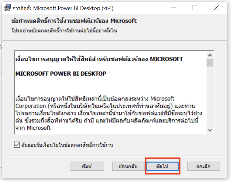 5. กดถัดไปเพื่อเริ่มการติดตั้งโปรแกรม Power BI Desktop