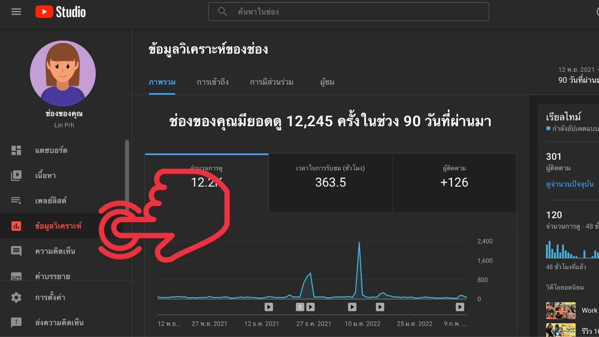 YouTube Analytics จะอยู่แถบซ้ายมือใน YTStudio หรือในภาษาไทยจะใช้คำว่า “ข้อมูลวิเคราะห์” ดังรูปด้านล่าง