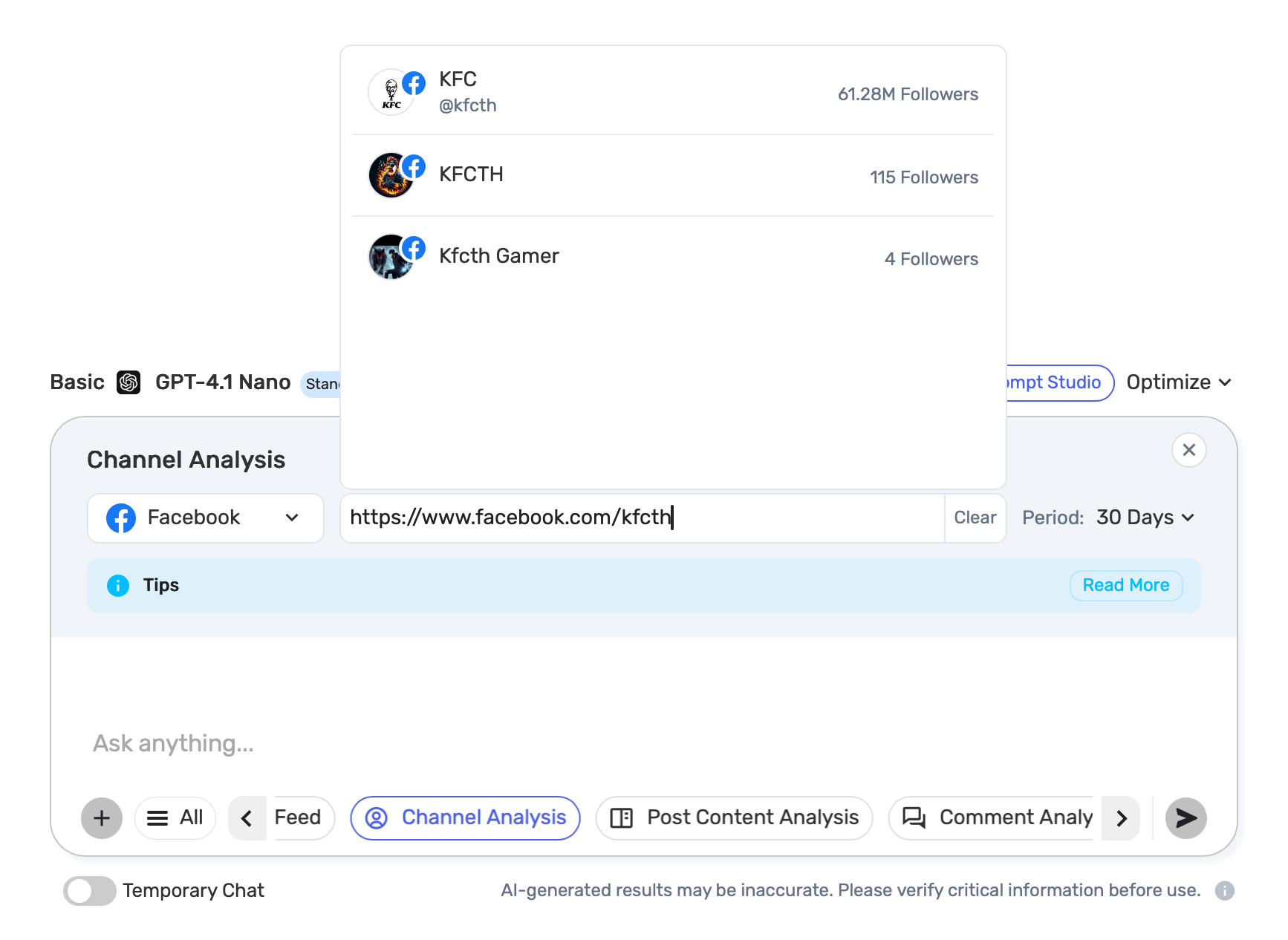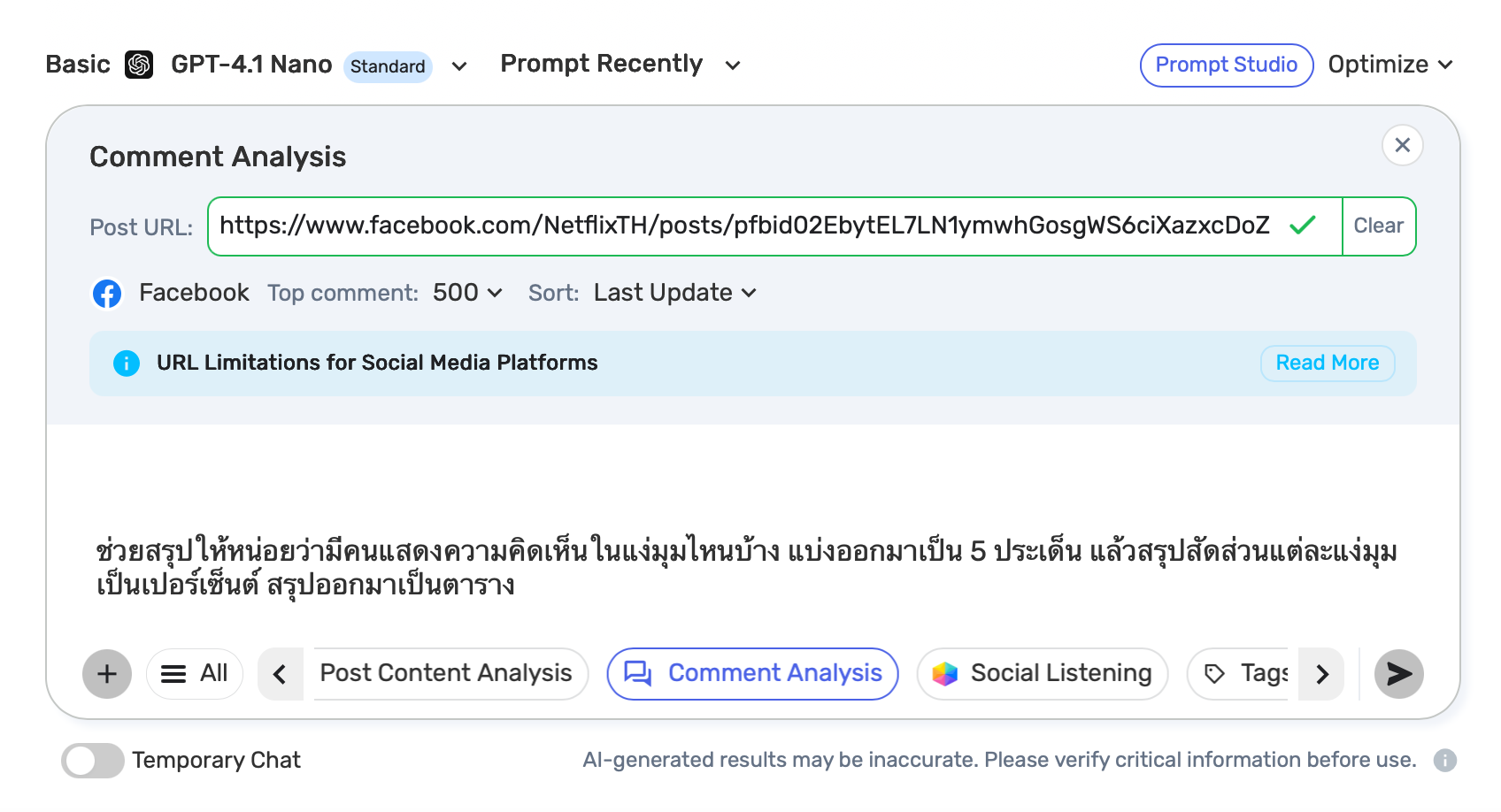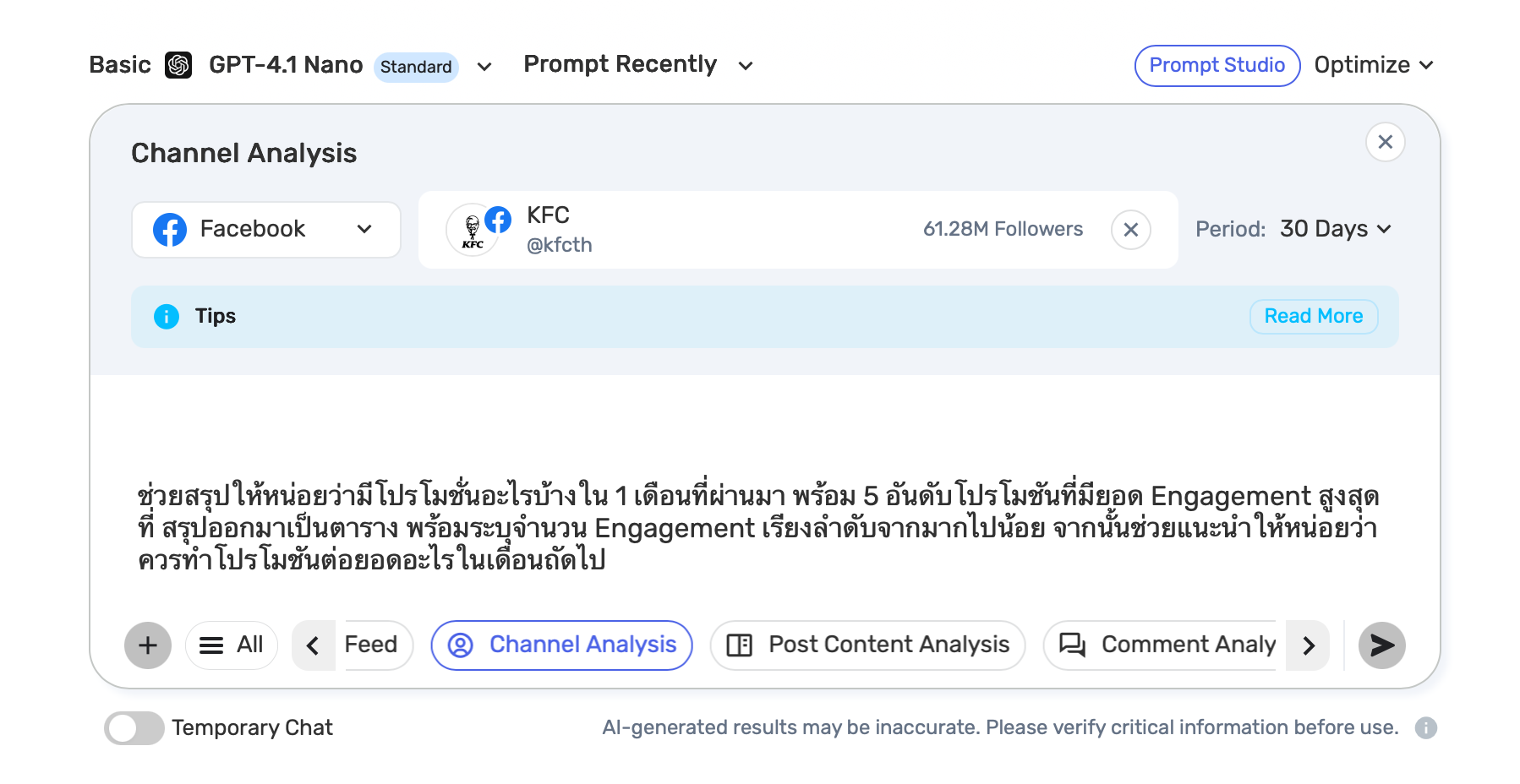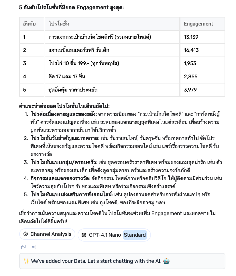 จากนั้นพิมพ์ Prompt ที่ต้องการโดยภาษาคนปกติได้เลยครับ อย่างเช่นผมต้องการวิเคราะห์ว่าในช่วง 30 วันที่ผ่านมา KFC ทำโปรโมชันอะไรออกมาบ้าง แล้วโปรโมชันไหนที่มียอด Engagement สูงที่สุด และเรายังสามารถให้ AI ช่วยแนะนำหรือคิดไอเดียเพื่อต่อยอดเป็นการทำแคมเปญหรือโปรโมชันในเดือนถัดไปได้ด้วยครับ