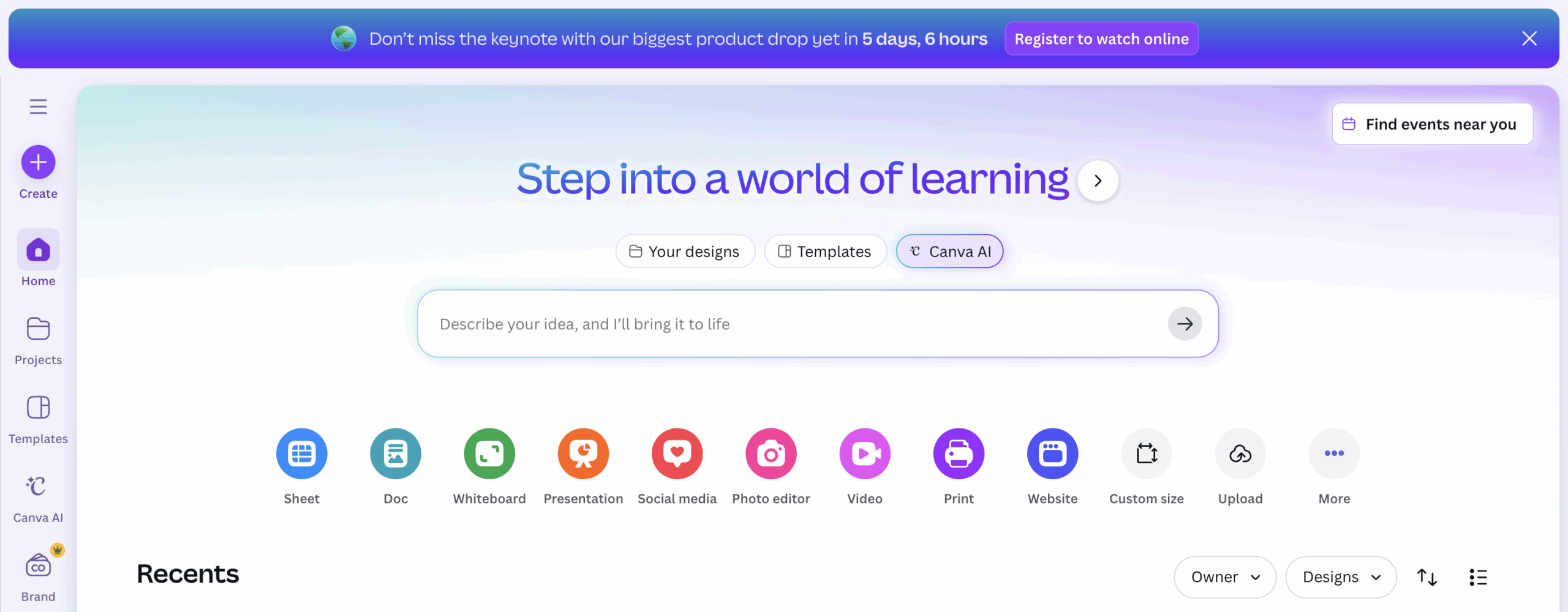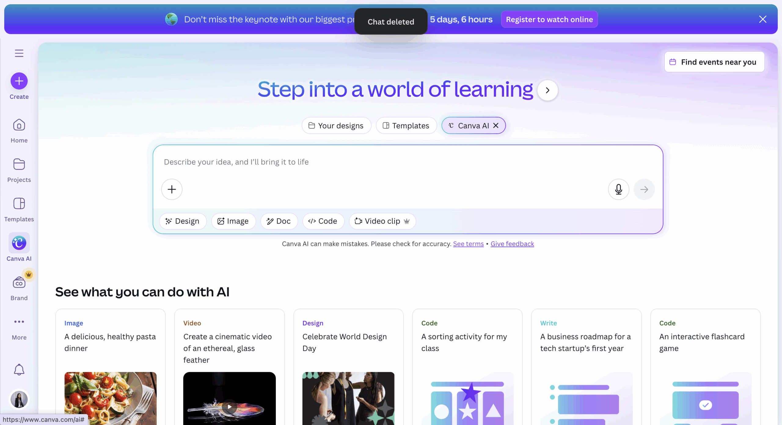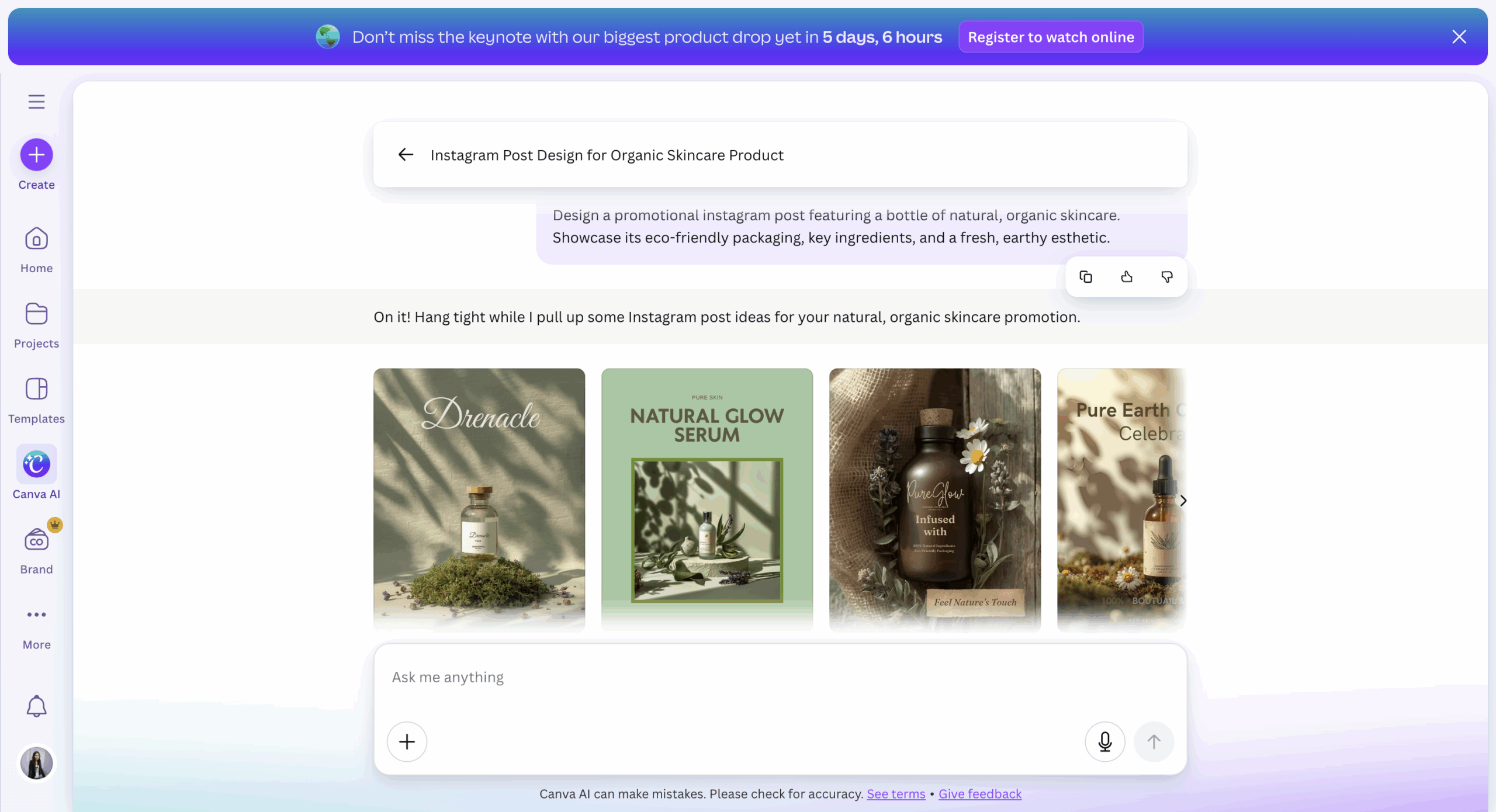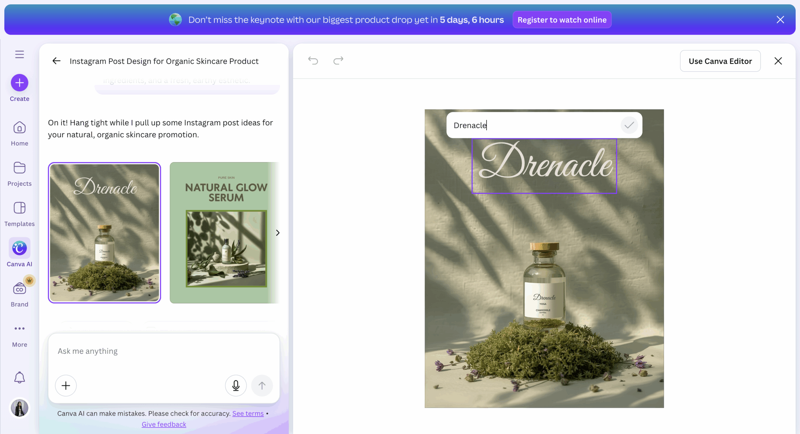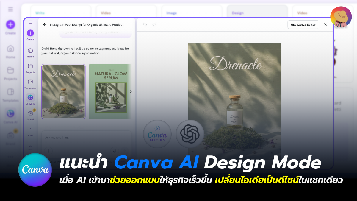 ต่อมาเป็นตัวอย่างหนึ่ง เป็นการออกแบบโพสต์โปรโมตสินค้าสกินแคร์ออร์แกนิก ภายใต้แบรนด์ Drenacle เราพิมพ์เพียงว่า Design a promotional Instagram post featuring a bottle of natural, organic skincare. Showcase its eco-friendly packaging, key ingredients, and a fresh, earthy aesthetic. เสร็จแล้ว AI จะสร้างโพสต์ Instagram ที่มีองค์ประกอบทั้งภาพสินค้า พื้นหลังธรรมชาติ และข้อความโปรโมตในโทนอบอุ่นสบายตา ซึ่งเราสามารถปรับแก้ไขต่อได้ทันทีในแชทครับ