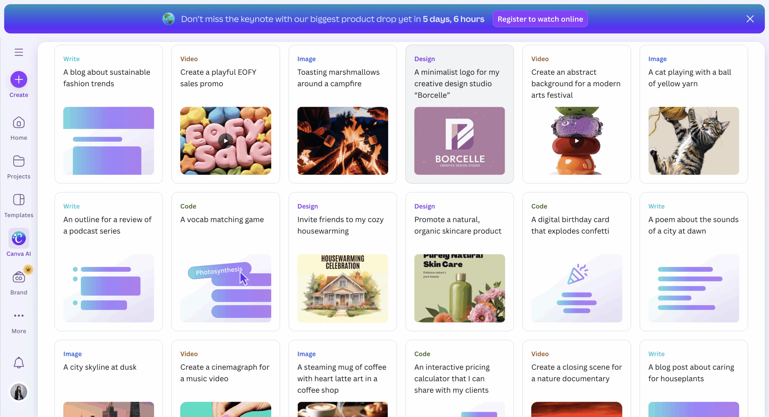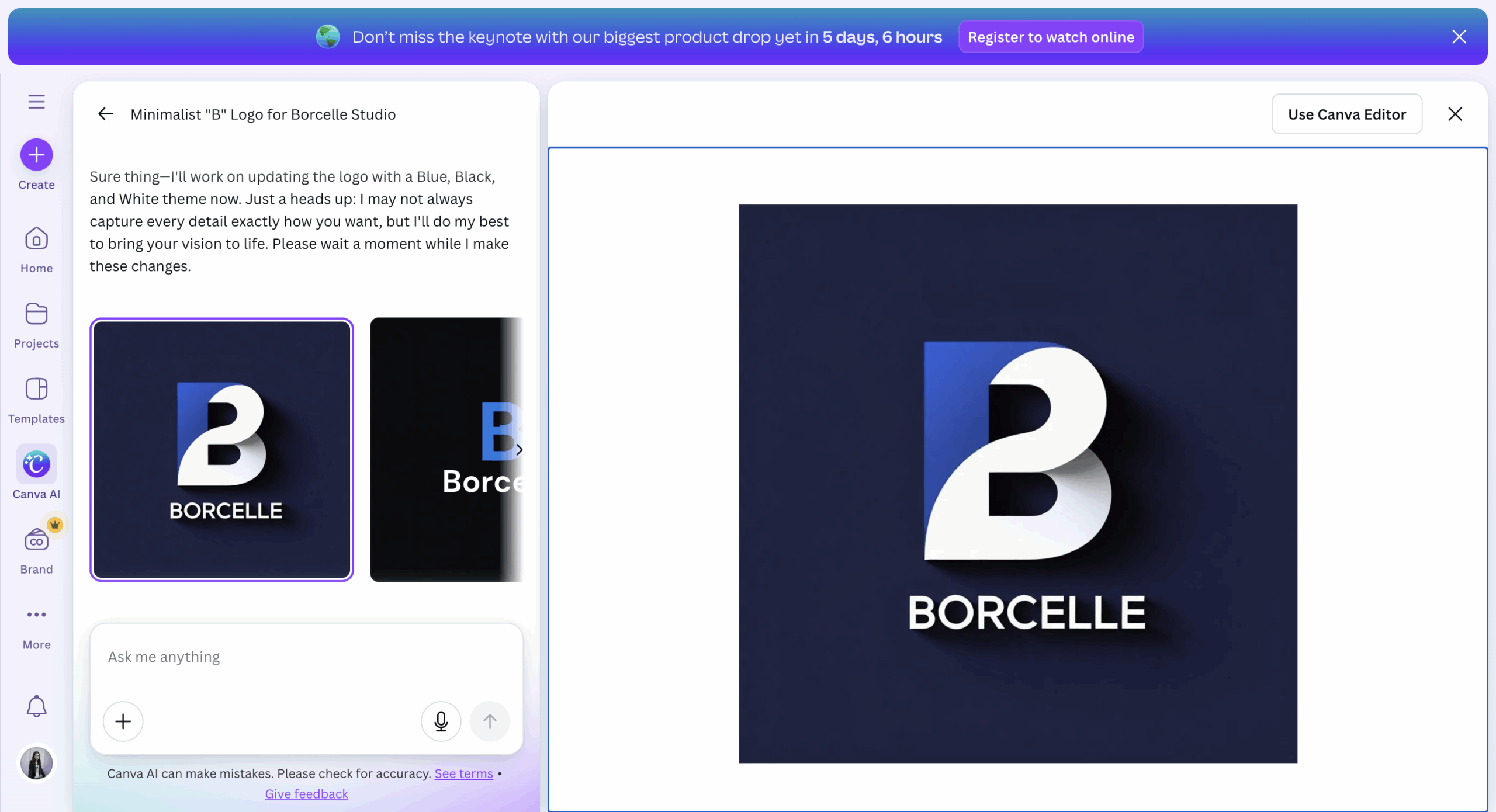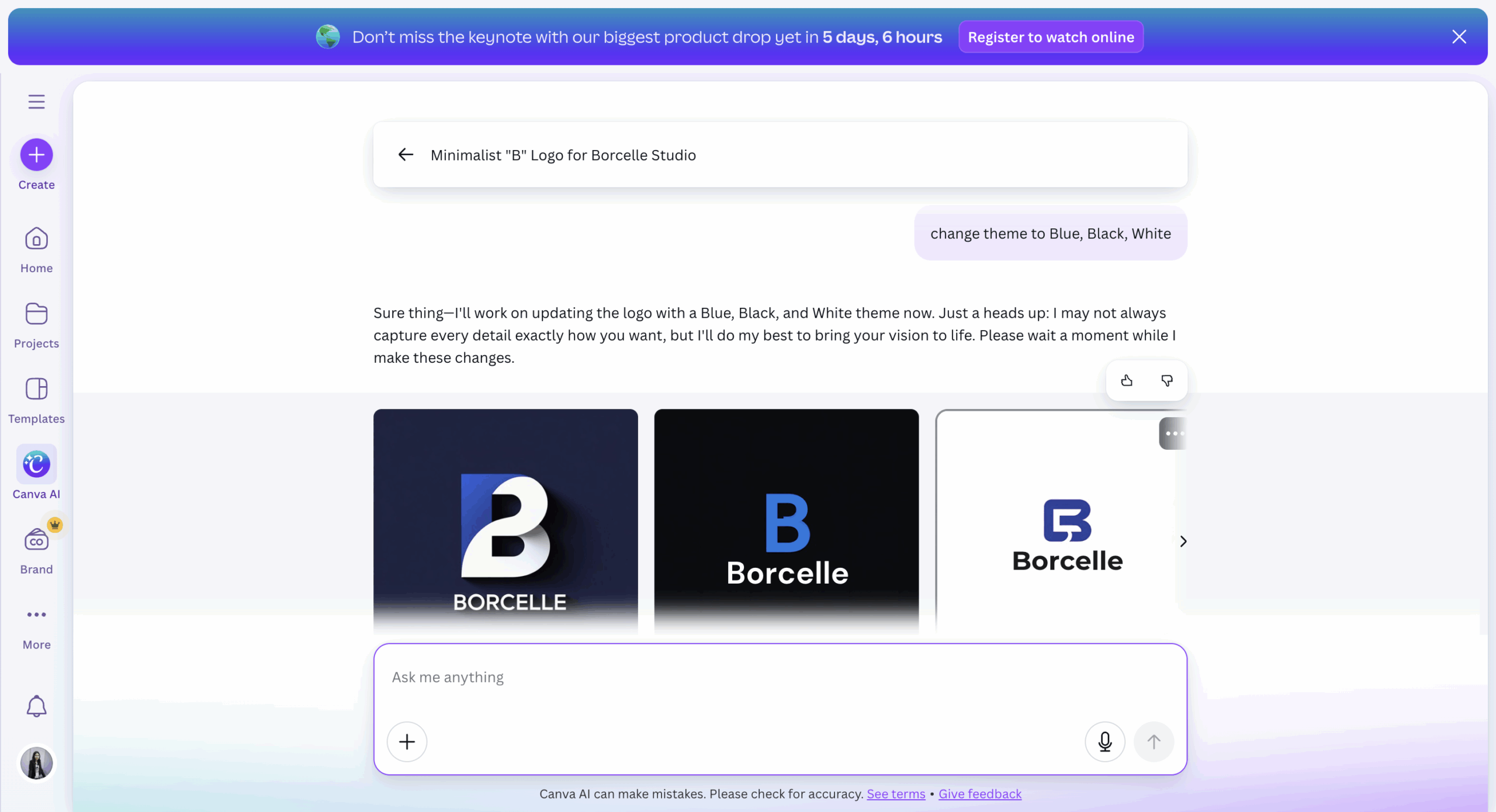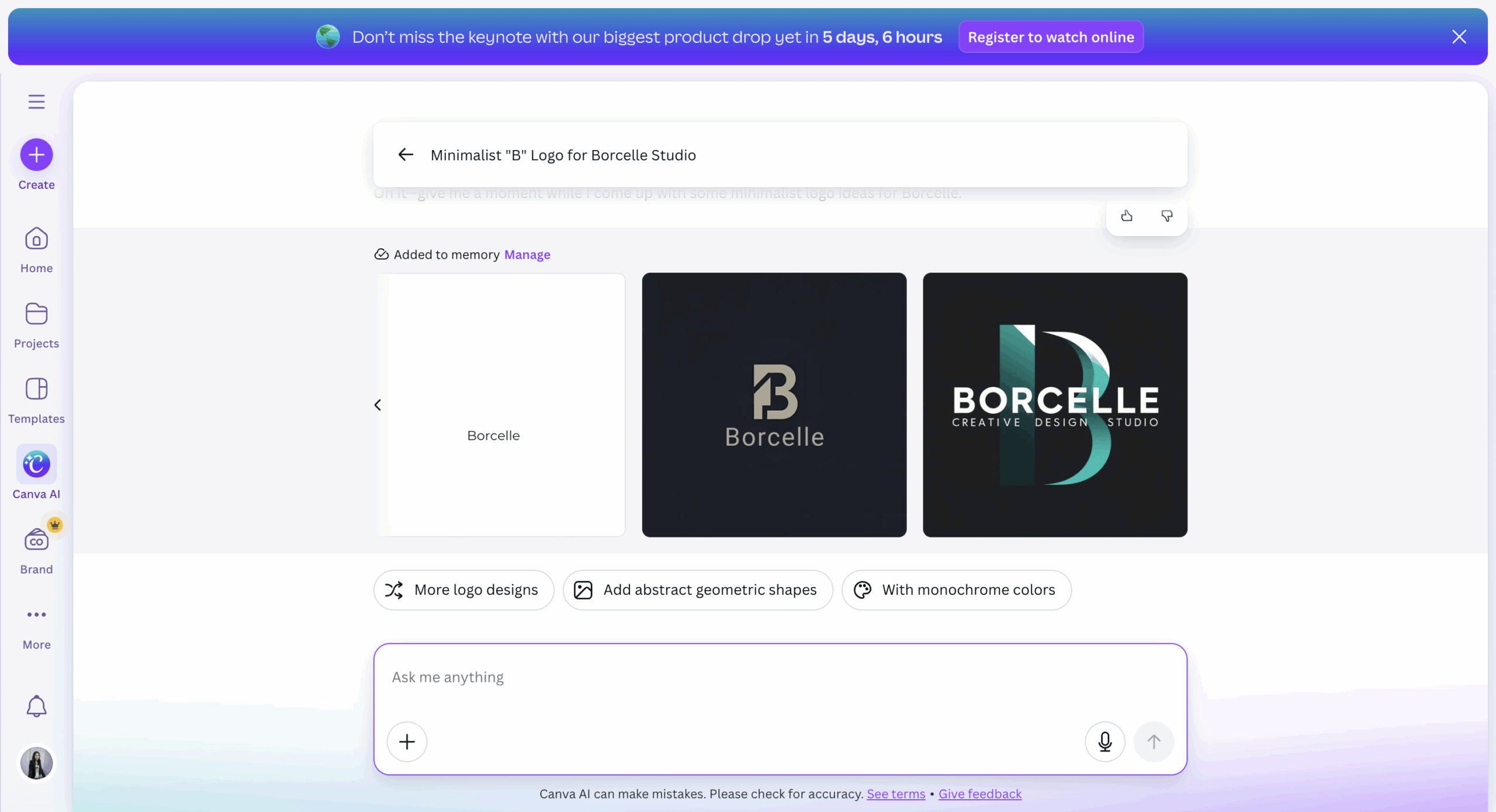 ตัวอย่างแรก เราจะลองสร้างโลโก้ชื่อ Borcelle ในหน้า Canva AI ผู้ใช้เพียงพิมพ์คำสั่งว่า Design a minimalist logo for my creative design studio, Borcelle, emphasizing the letter B.แล้ว AI จะสร้างต้นแบบโลโก้ออกมาหลายแบบ ทั้งที่เน้นตัวอักษร B เป็นสัญลักษณ์หลัก หรือใช้เส้นเรขาคณิตเพื่อให้ดูเรียบแต่มีพลังครับ