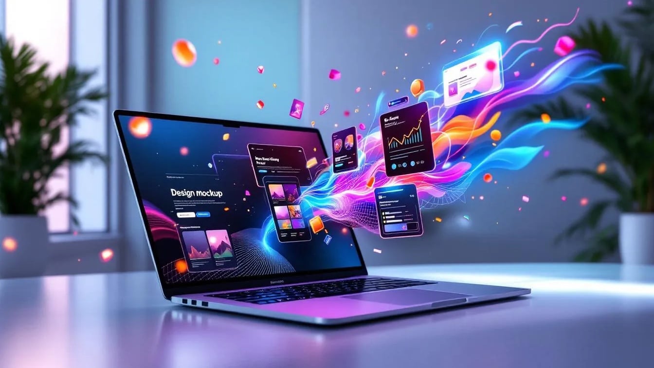 ขอบคุณภาพจาก Shutterstock AI Generator Prompt : A cinematic realistic image showing abstract flow of ideas transforming into colorful design mockups floating around a laptop. Symbolizing creativity and AI-assisted design workflow. Clean futuristic style.