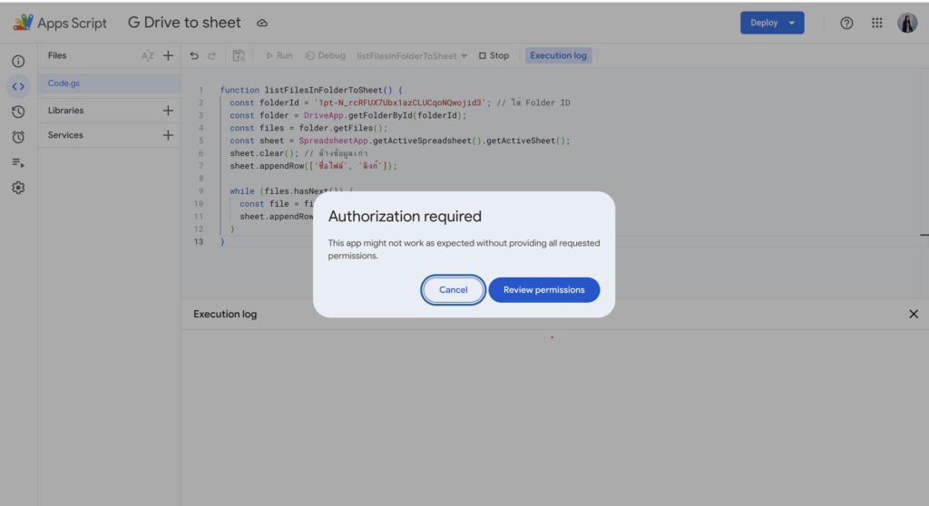 ก่อนอื่นเราต้องให้ GPT ช่วยเขียนโค้ดโดยตั้งโจทย์ให้ชัดเจนว่าเราต้องการอะไร เช่น“ช่วยเขียน Google Apps Script เพื่อดึงชื่อไฟล์และลิงก์ของไฟล์ทั้งหมดในโฟลเดอร์ ID นี้ มาแสดงใน Google Sheet โดยเรียงลำดับตามชื่อไฟล์”