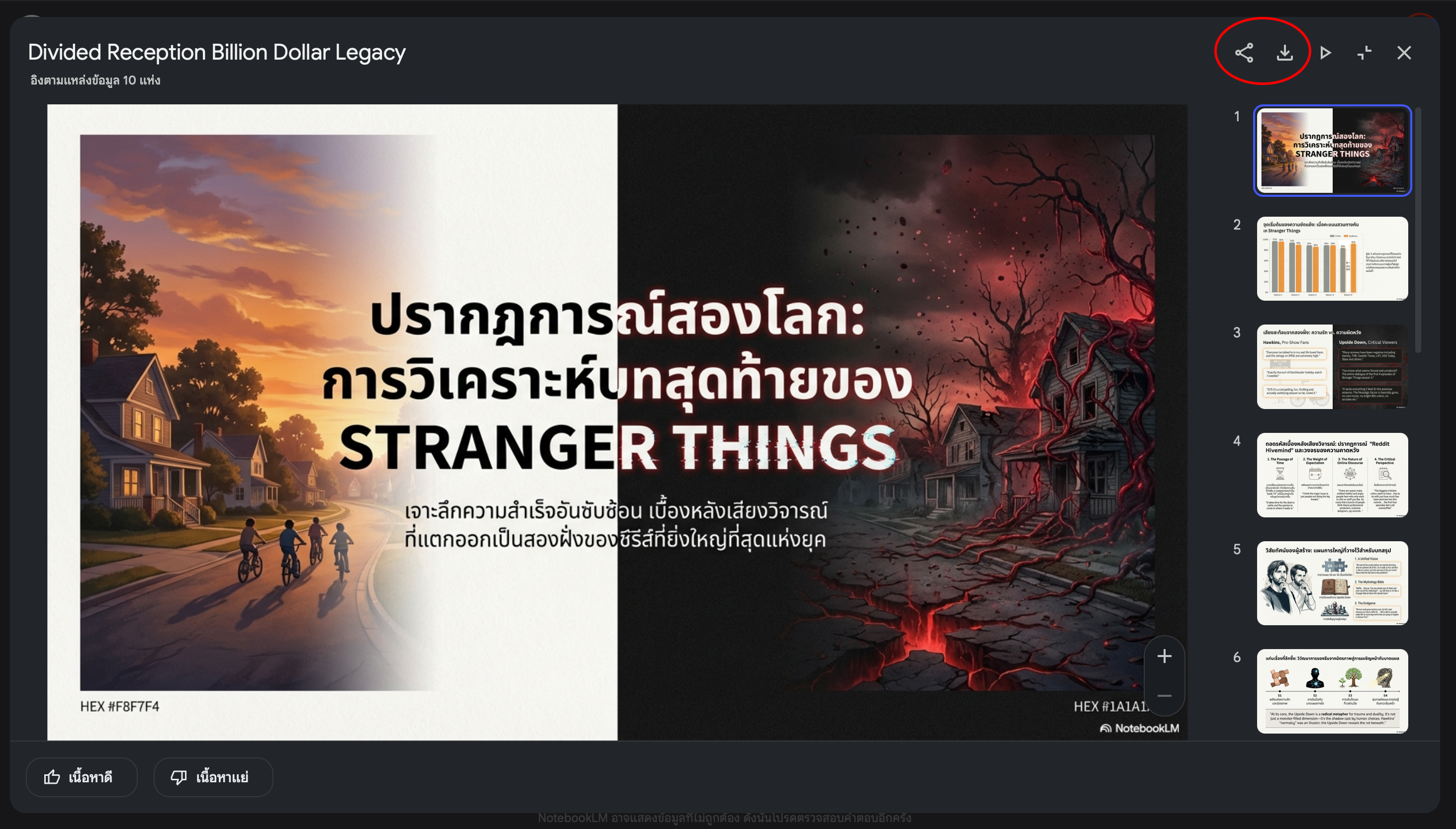 ต่อมาคือแบบที่ 2 ซึ่งใช้ Deep Research แทนการใช้ Source หรือหาด้วยตัวเองแล้วอัปโหลดมาใส่ครับ ขั้นแรก สร้าง Notebook ใหม่ขึ้นมา ตรงเมนูด้านซ้ายจะให้ค้นหาแหล่งข้อมูลใหม่บนเว็บ ซึ่งเราสามารถพิมพ์ค้นหาแหล่งข้อมูลที่เราต้องการได้เลยครับ ช่วงนี้ Stranger Things Season 5 กำลังมาแรง ผมเลยขอยกตัวอย่างด้วยการใช้ Deep Research ให้ช่วยเจาะลึกบทสรุปและเบื้องหลังความสำเร็จของแฟรนไชส์เรื่องนี้ครับ