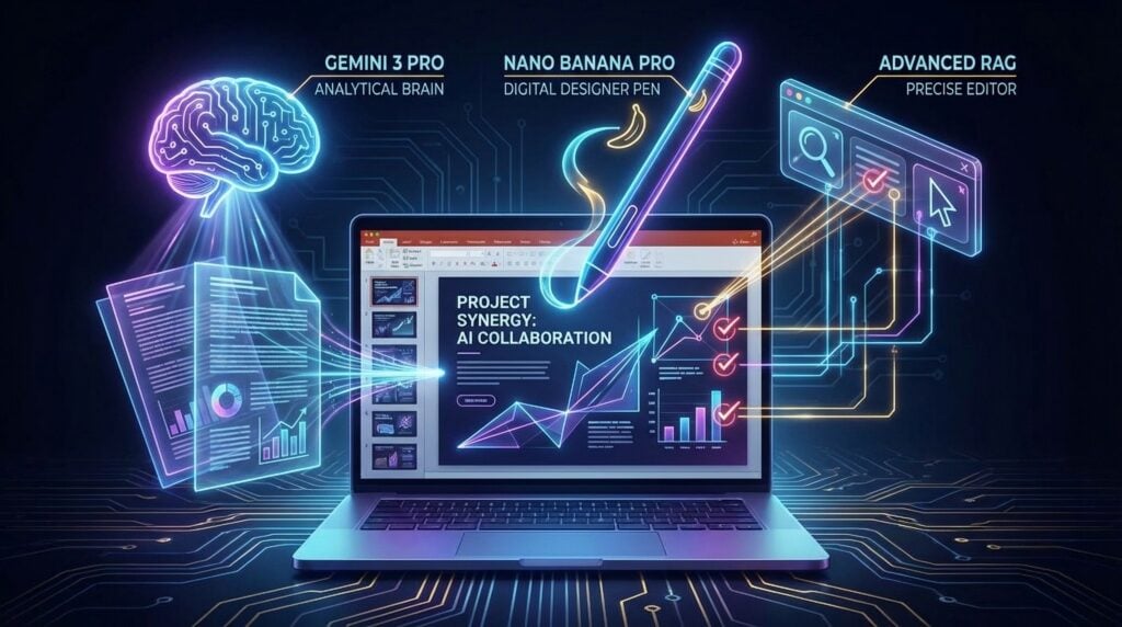 AI Generated by Shutterstock (Prompt: A conceptual illustration showing three AI agents working together: – Gemini 3 Pro as a glowing analytical brain reading large documents – Nano Banana Pro as a digital designer pen creating sharp text and visuals – Advanced RAG as a precise editor with reference markers All collaborating to build slide pages on a laptop screen. Futuristic, clean, data-driven design.)