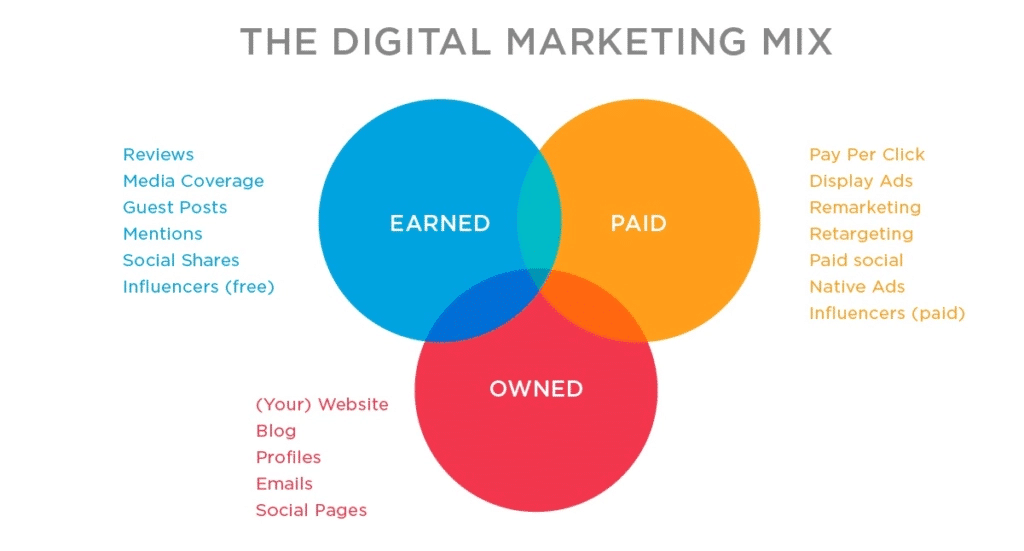 Paid Media: โฆษณา ที่เราต้องจ่ายเงิน เช่น ยิง ads เฟสบุ๊ค Owned Media: เว็บไซต์ บล็อก โซเชียลมีเดียของแบรนด์ Earned Media: รีวิว บทความ ข่าว