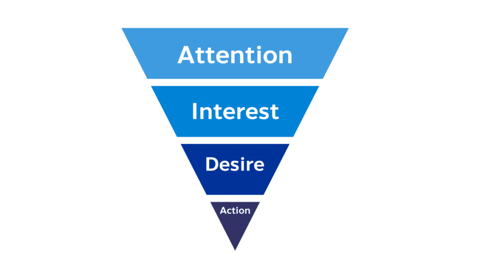 ซึ่งการใช้ร่วมกับ Marketing Funnel จะช่วยให้เราวางแผนกลยุทธ์การตลาดได้อย่างครอบคลุมและมีประสิทธิภาพมากขึ้นค่ะ โดยเราจะนำ AIDA มาเป็นแนวคิดหลักในการสื่อสารในแต่ละขั้นตอนของ Funnel เพื่อนำลูกค้าไปสู่การซื้อในที่สุด ลองมาดูกันค่ะว่าแต่ละขั้นตอนเราจะประยุกต์ใช้ AIDA ได้อย่างไรบ้าง