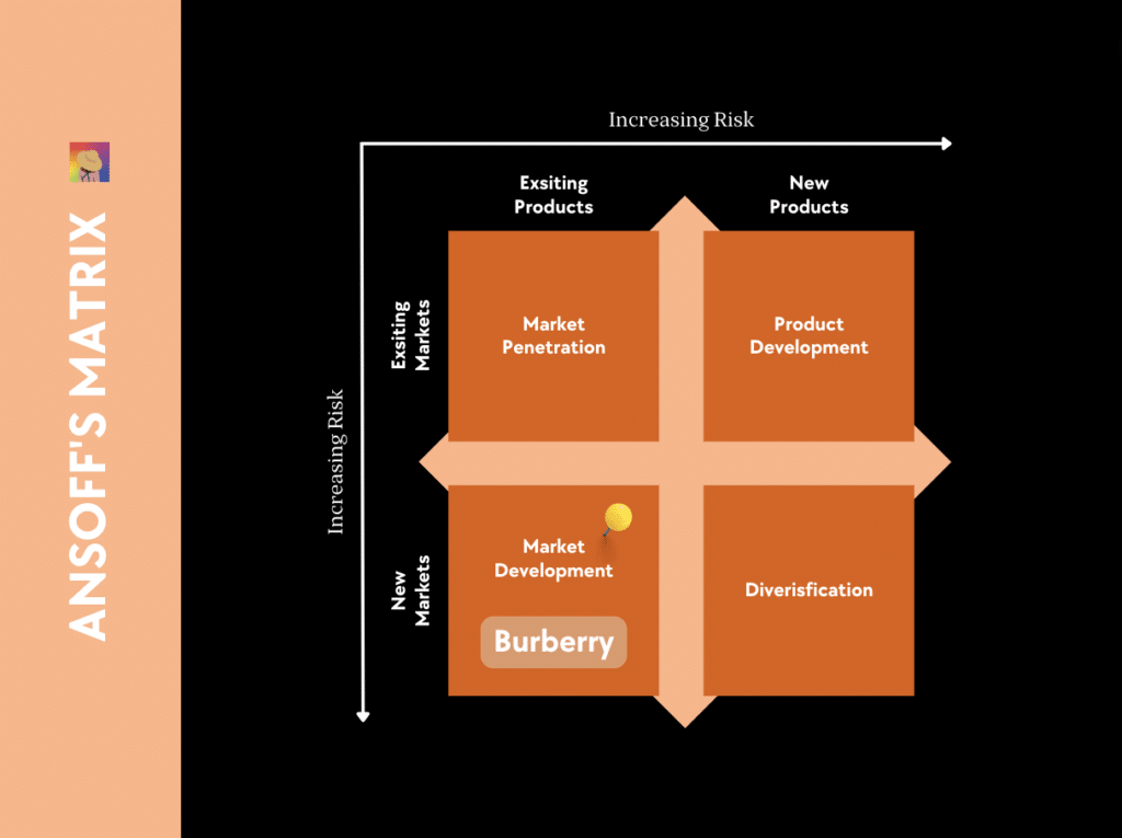 ถ้าลองวิเคราะห์ว่าสิ่งที่ Burberry พยายามทำผู้เขียนวิเคราะห์ว่าอยู่ในช่องของ Market Development ใน Ansoff Matrix เพราะด้วยความที่ Burberry พยายามที่จะเข้าถึงตลาดใหม่