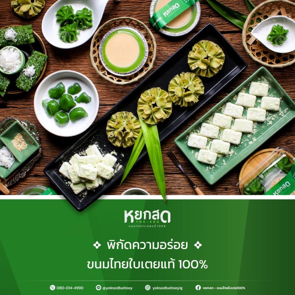 Social Media ตอกย้ำความเป็นขนมไทยใบเตย: หยกสดใช้โซเชียลมีเดียในการโปรโมตผลิตภัณฑ์และสื่อสารกับลูกค้า เช่น การโพสต์ภาพขนมที่มีสีสันสวยงามและน่าทาน การแชร์สูตรหรือเรื่องราวเบื้องหลังของผลิตภัณฑ์ ซึ่งช่วยสร้างการมีส่วนร่วมและการรับรู้ในกลุ่มลูกค้าเป้าหมาย