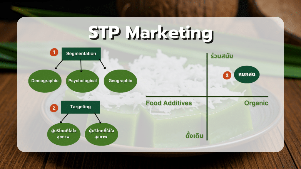 Psychographic Segmentation เป็นกลุ่มลูกค้าที่ชื่นชอบขนมไทย แต่ก็ต้องการแต่ความแปลกใหม่ในรสชาติและรูปลักษณ์ รวมถึงกลุ่มที่ให้ความสำคัญกับสุขภาพและต้องการขนมที่มีความหวานน้อยกว่า