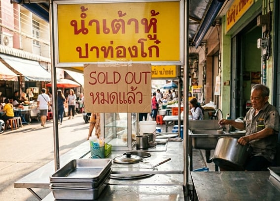 ขอบคุณภาพจาก Gemini Pro3 Prompt : “candid street photograph of an old, traditional tofu shop in a busy Asian market during late morning. The sun is bright and high. The front display counters are empty and wet, with metal trays stacked to the side. A large, hand-written cardboard sign hanging prominently in front reads “SOLD OUT” and “หมดแล้ว”. An elderly shopkeeper is relaxed, washing a large pot in the background. The street outside has a few pedestrians. Film grain.”