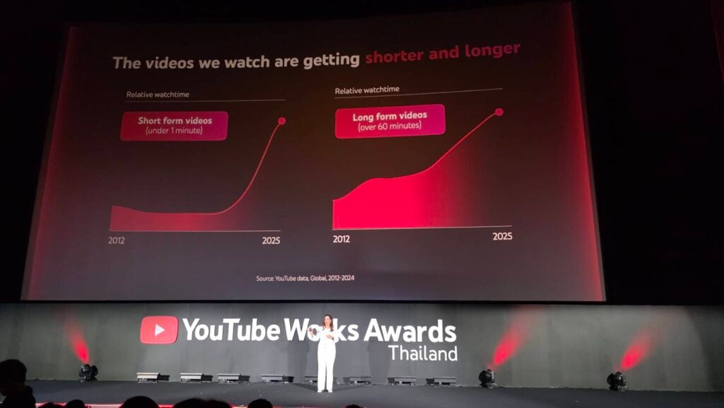 ซึ่งคุณ Sapna Chadha รองประธาน Google ภูมิภาคเอเชียตะวันออกเฉียงใต้และเอเชียใต้ กล่าวไว้ในงานอย่างน่าสนใจว่า “YouTube เป็นแพลตฟอร์มเดียวที่ผู้ชมสามารถสลับ Format, Genre และ Device ได้อย่างอิสระ ตั้งแต่วิดีโอสั้น ๆ บนมือถือ ไปจนถึงการรับชมเต็มตาบนทีวีจอใหญ่” นั่นทำให้ YouTube กลายเป็น “แพลตฟอร์มวิดีโอครบวงจร” ที่สามารถเชื่อมโยงประสบการณ์ของผู้ชมได้ในทุกช่วงเวลา ตั้งแต่การพักระหว่างทำงานจนถึงช่วงเวลาพักผ่อนของครอบครัว
