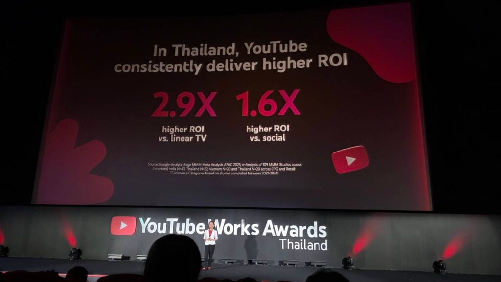 YouTube ไม่ได้เป็นแค่พื้นที่แห่งความบันเทิงอีกต่อไปครับ แต่กลายเป็นแพลตฟอร์มธุรกิจที่สร้างผลตอบแทนสูงสุดในไทย ข้อมูลจาก Analytic Edge บอกว่า YouTube สร้าง ROI ได้สูงกว่าโทรทัศน์ถึง 2.9 เท่า และสูงกว่าแพลตฟอร์มโซเชียลอื่นถึง 1.6 เท่า ซึ่งแสดงให้เห็นถึงประสิทธิภาพทั้งในด้านการสร้างการรับรู้และผลลัพธ์ทางยอดขาย