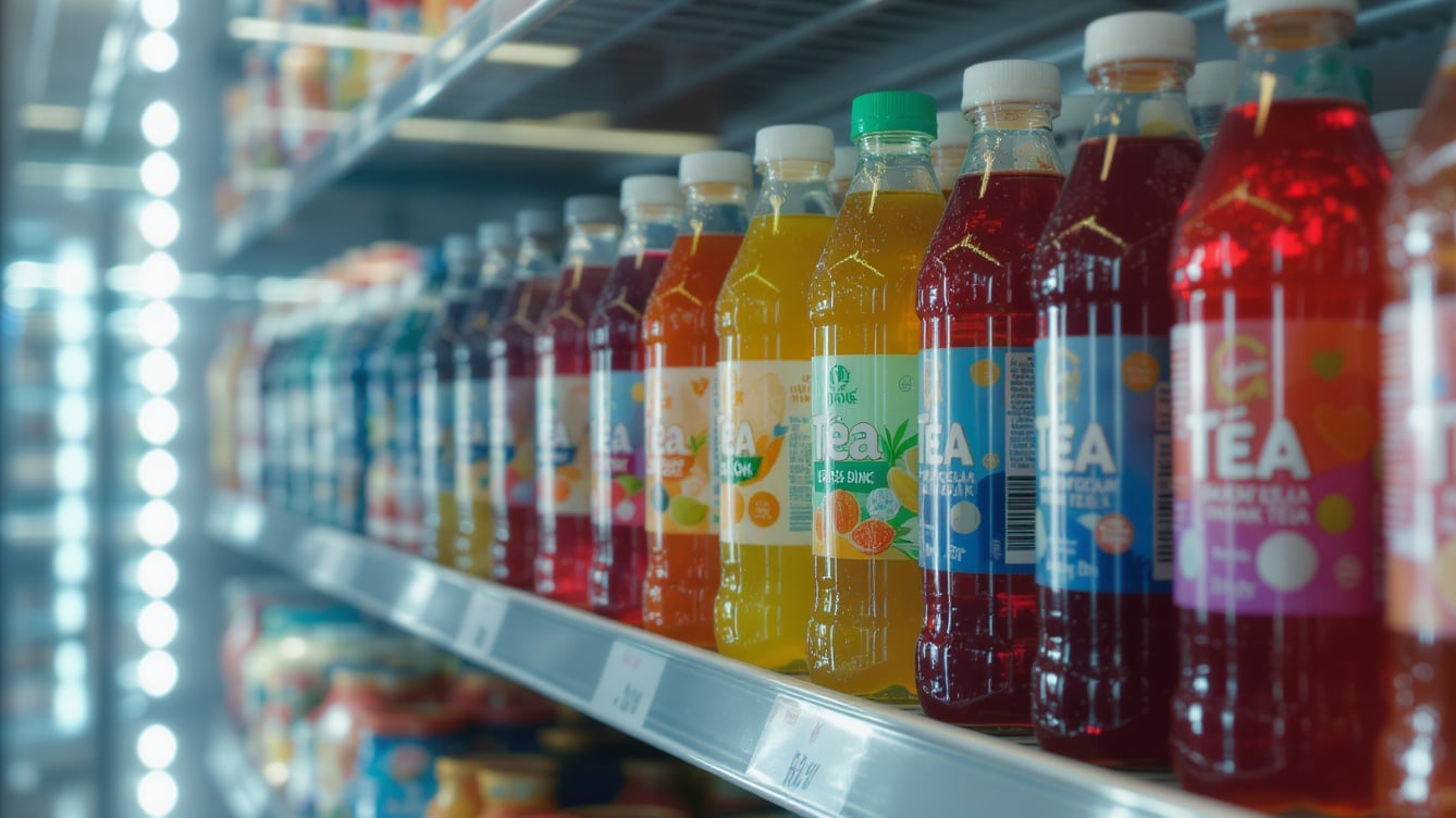 AI-Generated by Shutterstock (Prompt: a refrigerated display filled with various bottled ready-to-drink tea brands in different colors and labels, neatly arranged on shelves, condensation on the glass, bright cool lighting reflecting freshness, modern clean store background, realistic photography style, ultra-detailed, depth of field, cinematic lighting, horizontal composition –ar 16:9 –v 6 –style raw –q 2)