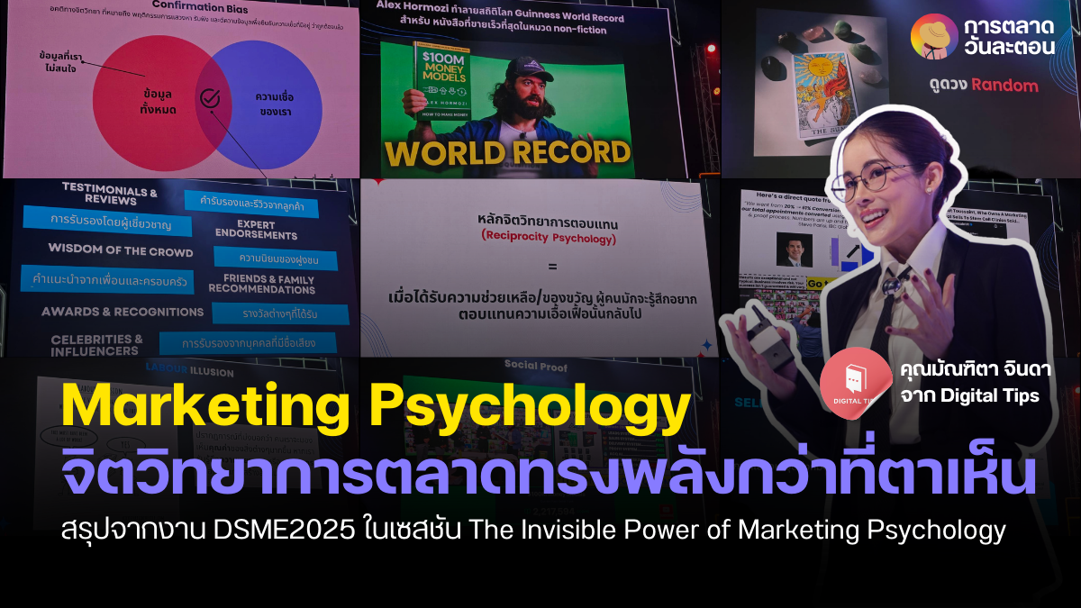 วันนี้ผมเลยอยากจะมาแชร์ความรู้จากงาน Digital SME Conference Thailand 2025 ในเซสชัน The Invisible Power of Marketing Psychology ชนะใจลูกค้าด้วยจิตวิทยาการตลาด โดย พี่ทิป หรือคุณมัณฑิตา จินดา จาก Digital Tips ที่เจาะลึกไปถึงแก่นว่าด้วยการสื่อสารกับลูกค้าในยุคนี้ โดยหัวใจสำคัญที่ผมอยากหยิบมาแชร์ให้ฟังก็คือ พลังของการทำความเข้าใจมนุษย์ให้ลึกถึงแรงจูงใจเบื้องหลัง เพื่อสร้างการเชื่อมต่อที่แท้จริงและยั่งยืนนั่นเอง