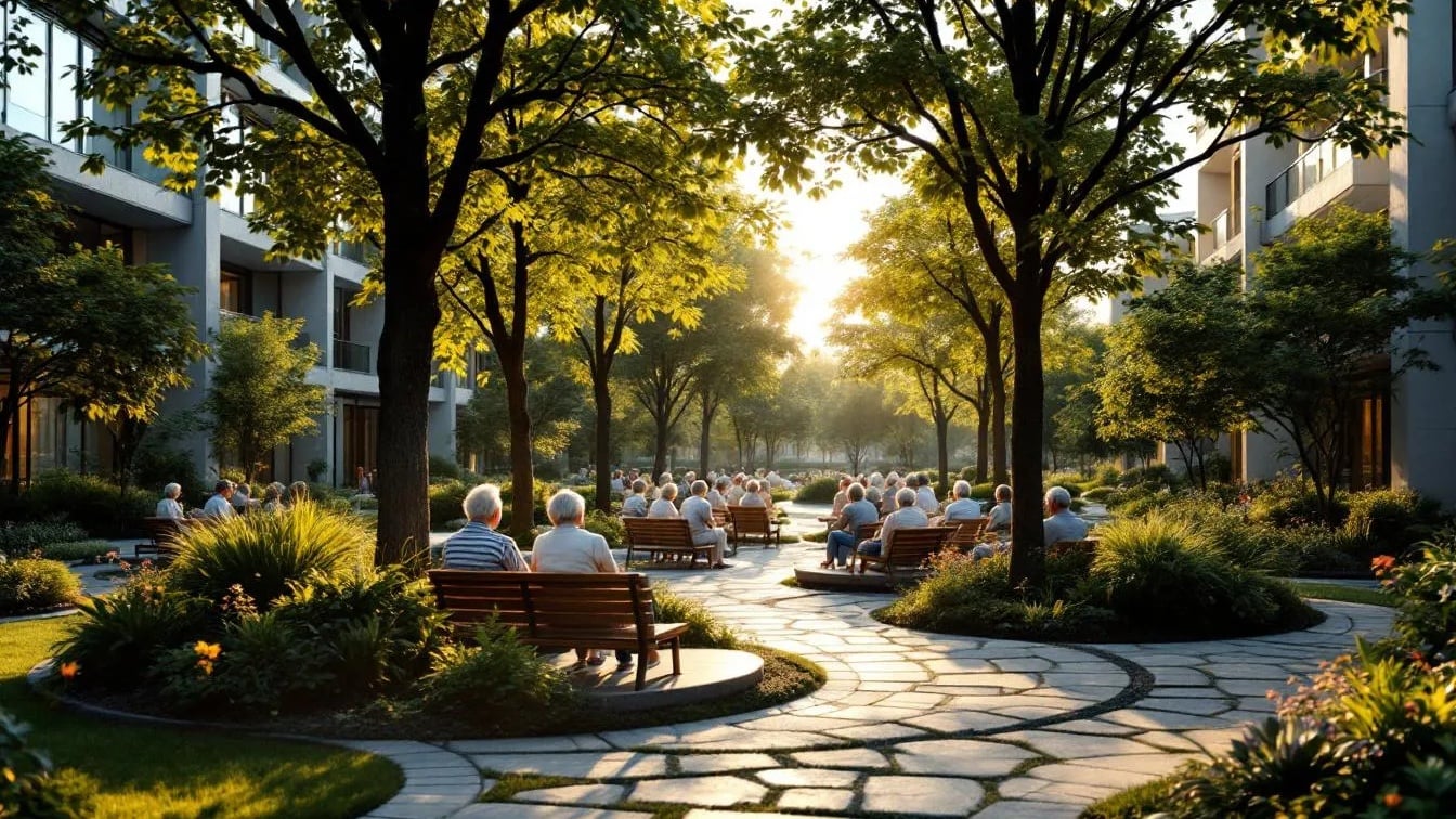 ขอบคุณภาพจาก Shutterstock AI Generator: elderly community nestled in the center of a modern condominium complex, surrounded by lush greenery and serene gardens, golden sunlight filtering through tall trees, calm and peaceful mood, cinematic lighting, detailed environment
