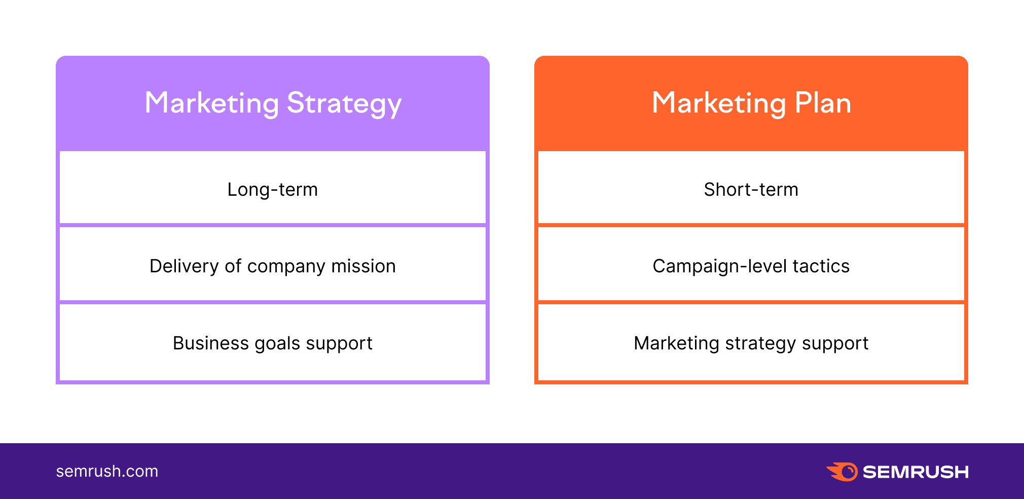 กลยุทธ์การตลาดจะระบุเป้าหมายในระยะยาวและภาพรวมทางการตลาดของธุรกิจ ในขณะที่แผนการตลาดจะเป็นแผนโดยละเอียด ซึ่งจะระบุการดำเนินการและกลวิธีที่จะทำให้บรรลุเป้าหมายในกลยุทธ์การตลาด